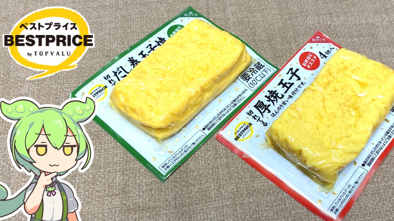 チルドタイプの玉子焼きです。お弁当にいかがでしょうか?<br><br><br>【参考】 <br>切れてるだし巻玉子(※本体価格138円/95g)(トップバリュ) <br><a href="https://www.topvalu.net/items/detail/4549414660647/" target="_blank" rel="noopener nofollow">https://www.topvalu.net/items/detail/4549414660647/</a><br> 切れてる厚焼き玉子(※本体価格138円/95g)(トップバリュ) <br><a href="https://www.topvalu.net/items/detail/4549414660630/" target="_blank" rel="noopener nofollow">https://www.topvalu.net/items/detail/4549414660630/</a> <br>有限会社みやけ食品 <br><a href="https://www.miyakeshokuhin.co.jp/" target="_blank" rel="noopener nofollow">https://www.miyakeshokuhin.co.jp/</a> <br>有限会社 みやけ食品(ごせん企業ガイドブック)<br> <a href="https://www.gosen-koyou.jp/html/guidebook/kigyou/kigyou-11.html" target="_blank" rel="noopener nofollow">https://www.gosen-koyou.jp/html/guidebook/kigyou/kigyou-11.html</a> <br>五泉市の湧水(新潟県五泉市)<br> <a href="https://www.city.gosen.lg.jp/organization/7/14/1475.html" target="_blank" rel="noopener nofollow">https://www.city.gosen.lg.jp/organization/7/14/1475.html</a> <br>カネテツデリカフーズ <br><a href="https://www.kanetetsu.com/" target="_blank" rel="noopener nofollow">https://www.kanetetsu.com/</a> <br>2025J3第4節 福島vs岐阜(Jリーグ) <br><a href="https://www.jleague.jp/match/j3/2025/030811/live/#live" target="_blank" rel="noopener nofollow">https://www.jleague.jp/match/j3/2025/030811/live/#live</a> <br><br>【使用した素材】(※敬称略) <br>(合成音声)VOICEVOX/ずんだもん/四国めたん <br><a href="https://voicevox.hiroshiba.jp/" target="_blank" rel="noopener nofollow">https://voicevox.hiroshiba.jp/</a> <br>(立ち絵)坂本アヒル <br><a href="https://seiga.nicovideo.jp/seiga/im10788496?track" target="_blank" rel="noopener nofollow">https://seiga.nicovideo.jp/seiga/im10788496?track</a> <br>(楽曲)甘茶の音楽工房/「楽しい麦畑」「フルーツパフェ」「お城の舞踏会」 <br><a href="https://amachamusic.chagasi.co" target="_blank" rel="noopener nofollow">https://amachamusic.chagasi.co</a>