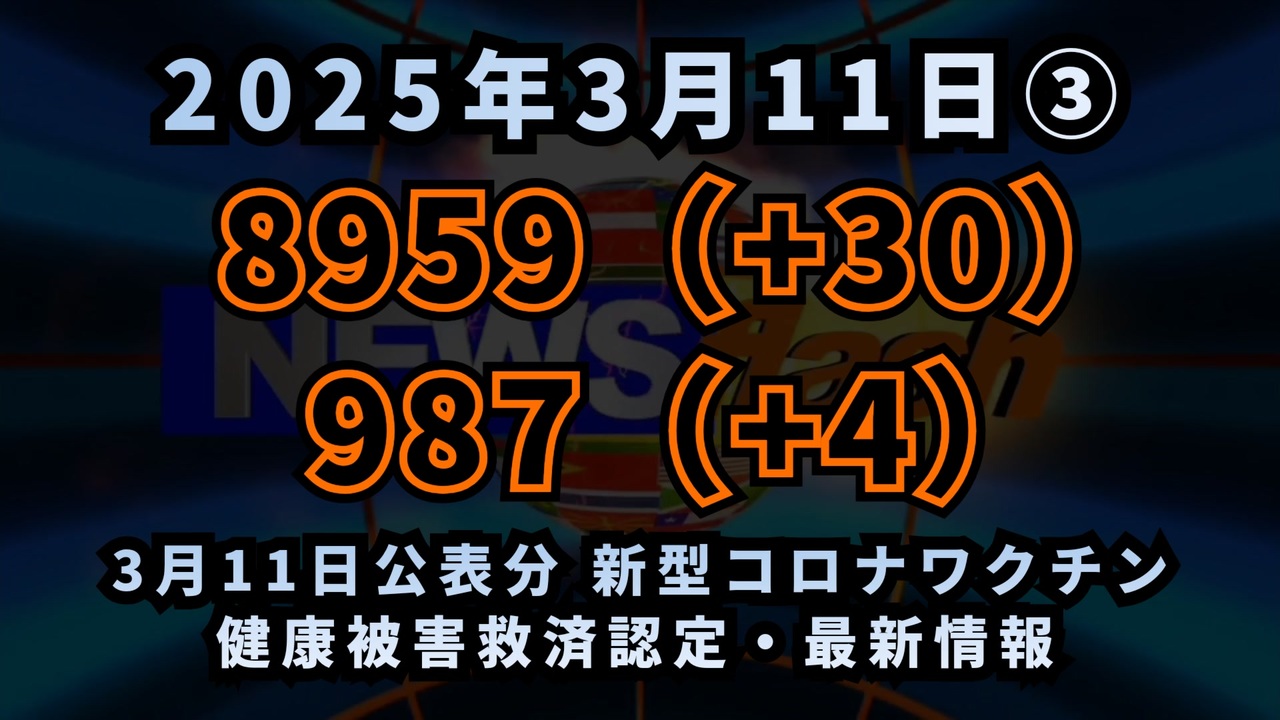疾病・障害認定審査会 予防接種健康被害救済制度<br>令和7年3月7日審議結果(3月11日公表分)<br><br>①今回の審議結果<br><br>申請数(審議件数): 99件<br>認定数: 30件<br>否認数: 64件<br>保留数: 5件<br><br>認定率: 約30.3%(30/99)<br>否認率: 約64.6%(64/99)<br><br><br>②死亡認定数、否認件数、認定率と否認率<br><br>死亡認定数: 4件(4/26)<br><br>死亡一時金のみ: 1件(62歳男性:突然死・糖尿病性腎症・腎不全)<br>葬祭料のみ: 2件(87歳女性:リウマチ性間質性肺炎の増悪・アスペルギルス症、82歳男性:突然死)<br>死亡一時金・葬祭料: 1件(47歳男性:急性心筋梗塞・虚血性心疾患)<br><br>死亡否認数: 21件<br>死亡保留数: 1件<br><br>死亡認定率: 約15.4%(4/26)<br>死亡否認率: 約80.8%(21/26)<br>死亡保留率: 約3.8%(1/26)<br><br><br>③累計認定数、累計死亡認定数<br><br>累計認定数: 8,959件<br>累計死亡認定数: 987件<br><br><br>④主な認定症例<br><br>特に多かった症例<br>ギラン・バレー症候群(複数例)<br>関節リウマチ(複数例)<br>視力障害・筋力低下・しびれなどの神経症状<br>心筋梗塞・脳梗塞などの循環器疾患<br><br><br>死亡認定症例<br>リウマチ性間質性肺炎の増悪<br>突然死<br>急性心筋梗塞・虚血性心疾患<br><br><br>疾病・障害認定審査会<br><a href="https://www.mhlw.go.jp/stf/shingi/shingi-shippei_127696_00006.html" target="_blank" rel="noopener nofollow">https://www.mhlw.go.jp/stf/shingi/shingi-shippei_127696_00006.html</a><br><br>今回の審議結果 3/11公表分<br><a href="https://www.mhlw.go.jp/stf/newpage_53962.html" target="_blank" rel="noopener nofollow">https://www.mhlw.go.jp/stf/newpage_53962.html</a><br><br>今回の台本<br><a href="https://keiichiro8140.hatenablog.com/entry/2025/03/11/224510?_gl=1*vkhnk8*_gcl_au*NDQ1MDIzNjI1LjE3MzQzMjI4MDY." target="_blank" rel="noopener nofollow">https://keiichiro8140.hatenablog.com/entry/2025/03/11/224510?_gl=1*vkhnk8*_gcl_au*NDQ1MDIzNjI1LjE3MzQzMjI4MDY.</a><br><br><br><br />著作権、肖像権に配慮して作成しております。<br><br>◆気になったニュースの台本!?<br>メモ代わりに作った台本をそのままあげてます<br><a href="https://keiichiro8140.hatenablog.com/." target="_blank" rel="noopener nofollow">https://keiichiro8140.hatenablog.com/.</a><br><br><br>ここからはシリーズ紹介<br><br><br>◆ ワクチン解毒・デトックス<br><a href="https://x.gd/fZweg" target="_blank" rel="noopener nofollow">https://x.gd/fZweg</a><br><br>◆ウイリアム・マキス博士のがん治療(イベルメクチン・フェンベンダゾール等)<br><a href="https://x.gd/AtFYS" target="_blank" rel="noopener nofollow">https://x.gd/AtFYS</a><br><br>◆予防接種健康被害救済制度<br><a href="https://x.gd/0xK9x" target="_blank" rel="noopener nofollow">https://x.gd/0xK9x</a><br><br>◆気になったニュース #1501~<br><br>◆ 【ショートver】気になったニュース<br><a href="https://x.gd/7MxXC" target="_blank" rel="noopener nofollow">https://x.gd/7MxXC</a><br><br>◆ 気になったニュース #1001~<br><a href="https://x.gd/Lp8gv" target="_blank" rel="noopener nofollow">https://x.gd/Lp8gv</a><br><br>◆ 気になったニュース #501~<br><a href="https://x.gd/EmbS4" target="_blank" rel="noopener nofollow">https://x.gd/EmbS4</a><br><br>◆ 気になったニュース #1~#500<br><a href="https://x.gd/uPhNb" target="_blank" rel="noopener nofollow">https://x.gd/uPhNb</a><br><br>◆ X(旧Twitter)・テレグラムで気になった情報<br><a href="https://x.gd/YG6FT" target="_blank" rel="noopener nofollow">https://x.gd/YG6FT</a><br><br>◆ 日比谷5万人パレードデ⚪生放送アーカイブ動画<br><a href="https://x.gd/3CHJv" target="_blank" rel="noopener nofollow">https://x.gd/3CHJv</a><br><br>◆日比谷5万人パレード⚪モのマイリスト作ってみました<br><a href="https://nico.ms/mylist/76828848?ref=sp_other" target="_blank" rel="noopener nofollow">https://nico.ms/mylist/76828848?ref=sp_other</a><br><br>◆3.30 令和の百姓⚪⚪<br><a href="https://www.nicovideo.jp/series/511791?ref=garage_share_other" target="_blank" rel="noopener nofollow">https://www.nicovideo.jp/series/511791?ref=garage_share_other</a><br><br>◆ 及川幸久さんの【XNEWS】シリーズ<br><a href="https://x.gd/3k78K" target="_blank" rel="noopener nofollow">https://x.gd/3k78K</a><br><br>◆これまでの動画<a href="https://x.gd/sPXoJ" target="_blank" rel="noopener nofollow">https://x.gd/sPXoJ</a><br><br>◆もしも(BAN)の時のためのマイリンク集<a href="https://lit.link/K-16_News44" target="_blank" rel="noopener nofollow">https://lit.link/K-16_News44</a><br><br>