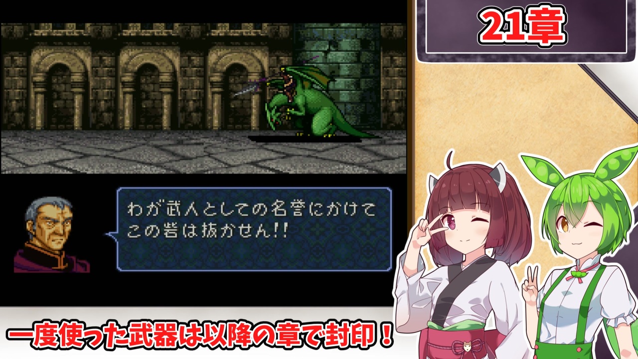 <span style="color: #85200c; font-size: 24px;"><strong><i>残された武器もかなり減ってきました</i></strong></span><br><br><br><br><span style="font-size: 16px;"><strong>1:一度使用した武器種は、以降の章で使用する事を禁止する。<br>2:武器の使用の定義は『その武器を装備した状態で敵との戦闘が発生したタイミング』<br>または『その武器を使って敵に「捕える」コマンドを実行したタイミング』<br>杖の場合は『対象に対して使用した時点(命中の可否は問わない)』とする。 </strong></span><br><span style="color: #ff0000; font-size: 16px;"><strong>※同盟軍、演出による戦闘イベントでは使用した判定にはならないこととする。</strong></span><span style="font-size: 16px;"><strong> <br>3:仲間を47人生存させ、【外伝】を含む全ての章を攻略し、総合評価でB以上の状態でゲームをクリアする。</strong></span><br><br><br>本動画のシリーズリスト【<a href="https://www.nicovideo.jp/series/482976" target="_blank" rel="noopener">series/482976</a>】<br>『烈火』の同縛りプレイ【<a href="https://www.nicovideo.jp/series/406473" target="_blank" rel="noopener">series/406473</a>】<br>『封印』の同縛りプレイ【<a href="https://www.nicovideo.jp/series/316824" target="_blank" rel="noopener">series/316824</a>】<br>前:【<a href="https://www.nicovideo.jp/watch/sm44732022" class="watch">sm44732022</a>】次:【<a href="https://www.nicovideo.jp/watch/sm44768908" class="watch">sm44768908</a>】<br><br><strong>使用したソフト</strong><br>VOICEROID+東北きりたんEX<br>VOICEVOX:ずんだもん<br>VOICEPEA:ずんだもん<br><strong>お借りした素材</strong><br>ニコニコモンズの皆様(コンテンツツリー参照)