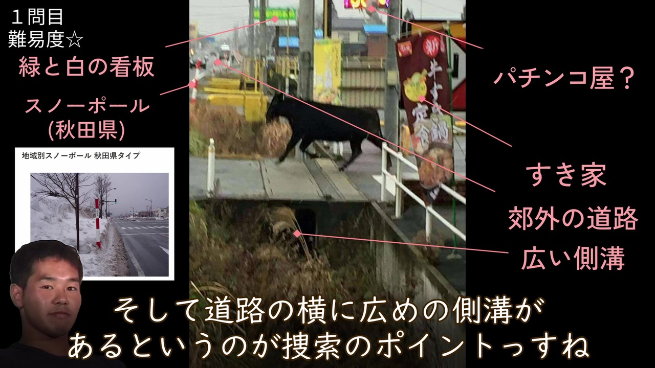特定するぞ!特定するぞ!特定するぞ!特定するぞ!特定するぞ!<br><br>第1回:<a href="https://www.nicovideo.jp/watch/sm44166524" class="watch">sm44166524</a><br><br>注意<br>・動画冒頭に寸劇がありますので苦手な方は00:46まで飛ばしてください。<br>・クッキー☆声優のお歌が流れます。<br>・特定する範囲は日本国内のみになります。<br><br>(投稿ミスったので上げなおし失礼しました。)<br><br>宿題の答え<br>4問目<br>答え:<a href="https://maps.app.goo.gl/Hqs9euq8QoUjjnbj9" target="_blank" rel="noopener nofollow">https://maps.app.goo.gl/Hqs9euq8QoUjjnbj9</a><br>範囲狭いのですぐ見つかる。<br><br>5問目<br>答え:<a href="https://maps.app.goo.gl/MvkTQMKMiYokqpss8" target="_blank" rel="noopener nofollow">https://maps.app.goo.gl/MvkTQMKMiYokqpss8</a><br>車線数で大きい道路とわかる。<br>横断歩道と間隔の狭い白破線がつながっているところは少ないので見つけやすい。<br><br>6問目<br>答え:<a href="https://maps.app.goo.gl/YU12JH81MsmiKhTcA" target="_blank" rel="noopener nofollow">https://maps.app.goo.gl/YU12JH81MsmiKhTcA</a><br>フェンスの絵を画像検索すると札幌の公園がみつかる。(1年くらい前は似てる絵しか検索で出なかった)<br>奥に高いマンションがあるので街中だとわかる。