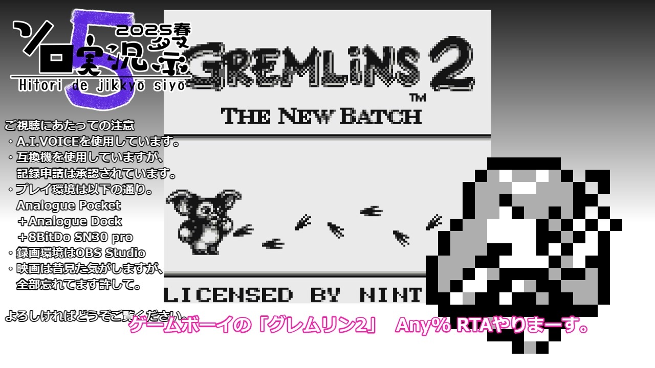 2しかないゲーム(1990年当時)は初投稿です。よかったら見てね。<br><br><br>無編集版はこちら:<a href="https://youtu.be/st56dHoszJs" target="_blank" rel="noopener nofollow">https://youtu.be/st56dHoszJs</a><br>Speedrun.com:<a href="https://www.speedrun.com/ja-JP/gremlins_2_the_new_batch" target="_blank" rel="noopener nofollow">https://www.speedrun.com/ja-JP/gremlins_2_the_new_batch</a><br><br>※FC版とは内容が大きく異なる為、GB版表記ではなく(GB)表記としています。<br><br><a target="_blank" href="https://qa.nicovideo.jp/faq/show/19424?site_domain=default" style="font-size: 13px;color: #657586; text-decoration: underline; line-height: 1.4">この動画は投稿者によって修正されました</a>