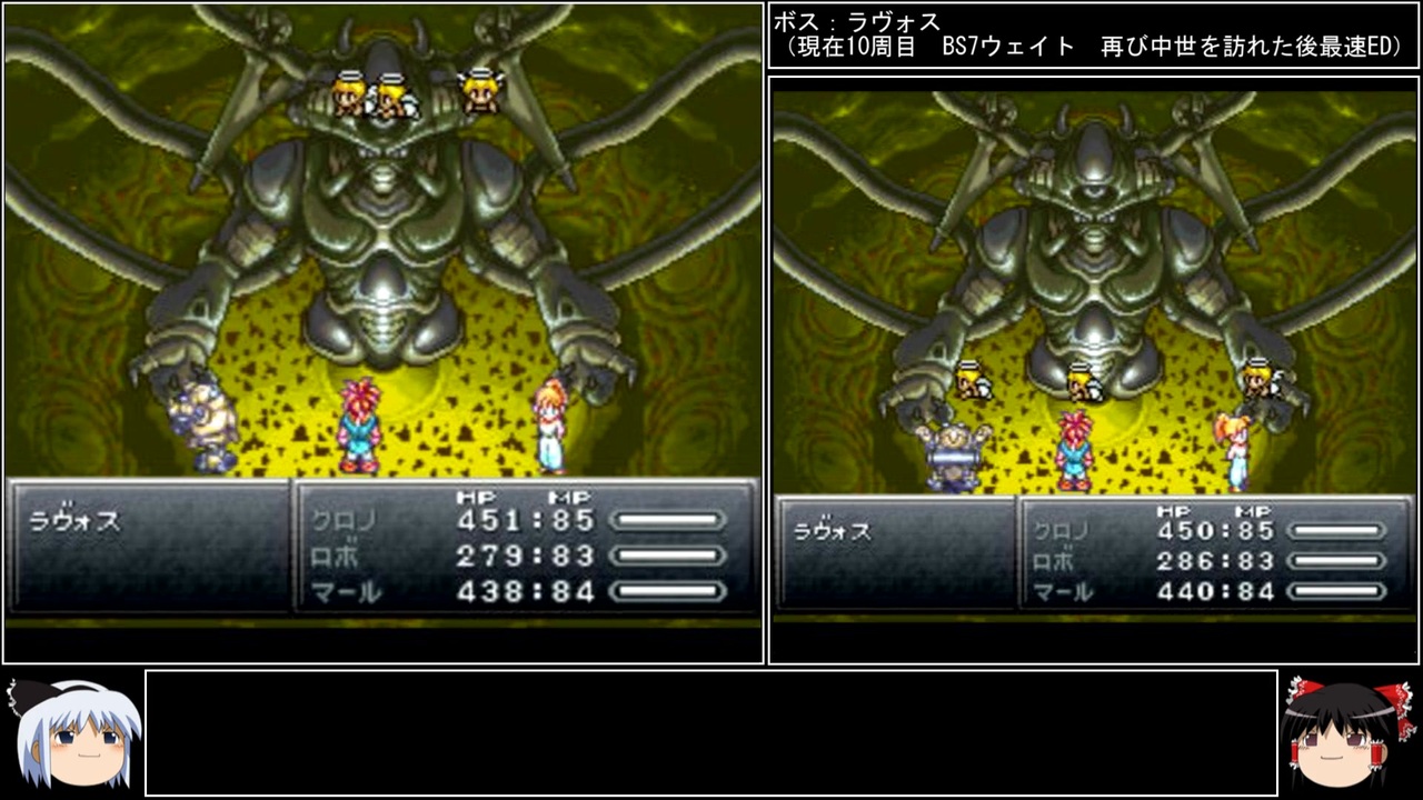 10周目のpart2です。<br>キープアレイズ(※ただしアレイズはキープしない)<br><br>マニアしか知らない豆知識 敵の連携編→<a href="https://www.nicovideo.jp/watch/sm44303555" class="watch">sm44303555</a><br>前→<a href="https://www.nicovideo.jp/watch/sm44732717" class="watch">sm44732717</a><br>次→<a href="https://www.nicovideo.jp/watch/sm44801060" class="watch">sm44801060</a><br><br>YouTube版→<a href="https://youtu.be/Td6p6VkPNG8" target="_blank" rel="noopener nofollow">https://youtu.be/Td6p6VkPNG8</a><br><br>縛りルール<br>①一度使った武器・防具・アクセサリー・道具・技・連携は<br> 次周回以降使用禁止(売却も解禁扱い)<br><br>②一度戦った敵シンボルとの再戦禁止。<br><br>③初戦闘の敵からの逃走禁止。<br><br>④裏技、バグ技、状況再現禁止。<br><br>⑤BS1アクティブからBS8ウェイトまで<br> 全てのバトルスピードとバトルモードで攻略する。<br><br>⑥各周回において見る予定のED条件を<br> 満たした段階で即ラヴォスと戦いに行く。<br><br>※ネタバレ注意です<br><br>このページ、動画で利用している弊社または弊社のライセンサーが権利を有する著作物の転載・配布は禁止いたします。<br>© 1995, 2018 SQUARE ENIX<br>Illustration: © 1995 BIRD STUDIO / SHUEISHA<br>Story and Screenplay: © 1995, 2008 ARMOR PROJECT / SQUARE ENIX<br><br>AquesTalk2ライセンスID:AQTK2WINUSR23122185<br /><br><br>❤いいねを押していただけるとモチベーションと投稿速度が上がるので宜しくお願い致します!<br><br>作者ツイッター→ <a href="https://twitter.com/nig0117" target="_blank" rel="noopener nofollow">https://twitter.com/nig0117</a><br>PIXIV FANBOX→ <a href="https://sutanokeiji.fanbox.cc/" target="_blank" rel="noopener nofollow">https://sutanokeiji.fanbox.cc/</a><br><br>( 以前はWEB小説書いてました→ <a href="https://kakuyomu.jp/works/1177354054884910267" target="_blank" rel="noopener nofollow">https://kakuyomu.jp/works/1177354054884910267</a> )