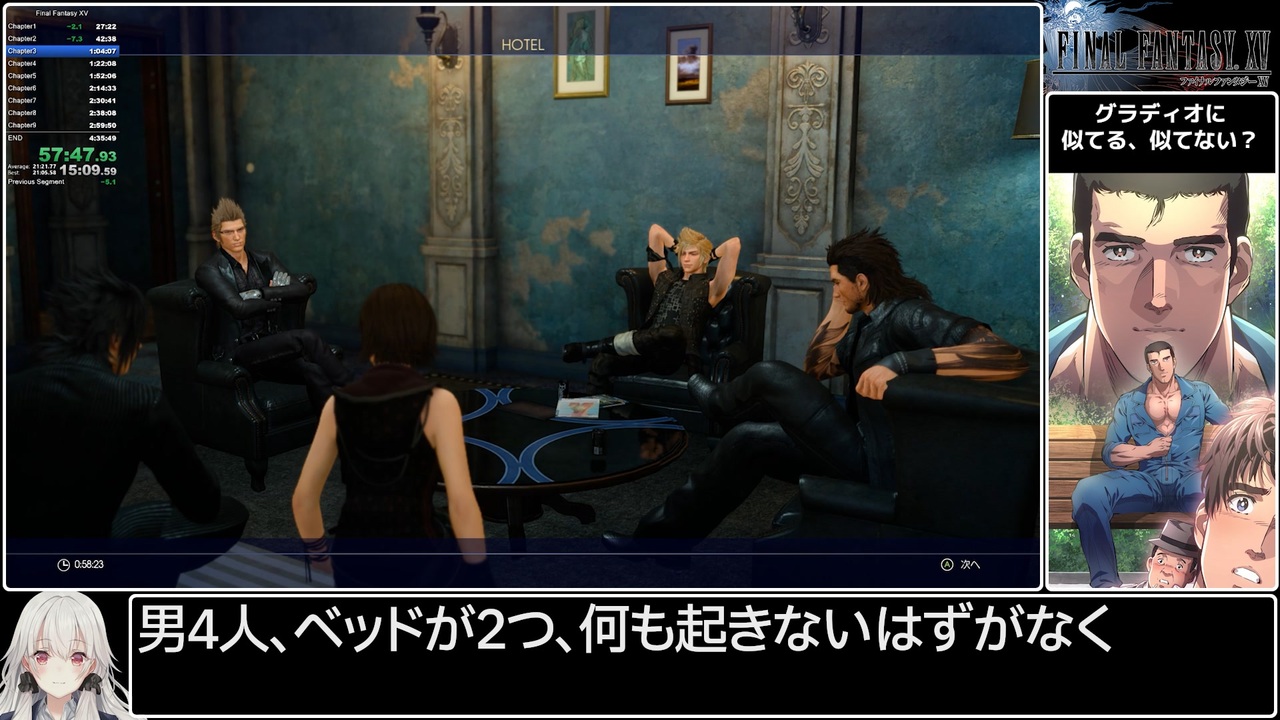 楽しいRTAであった。兄貴に会ったら、私の分まで走れと伝えて欲しい。<br><br>Part1→<a href="https://www.nicovideo.jp/watch/sm44556912" class="watch">sm44556912</a><br><br>【ゲーム概要】<br>・FINAL FANTASY XV(ファイナルファンタジー15)<br>・PC版 Steam(ロイヤルエディション)<br>・メニューグリッチ&カメラバグ禁止<br><br>記載されている会社名・製品名・システム名などは、各社の商標、または登録商標です。<br>Copyright (C) 2016-2017 SQUARE ENIX CO., LTD. All Rights Reserved.
