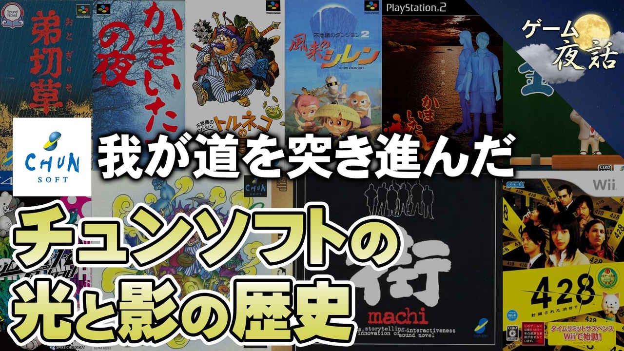 ▼ゲーム夜話マイリスト<br><a href="https://www.nicovideo.jp/mylist/56973971" target="_blank" rel="noopener nofollow">https://www.nicovideo.jp/mylist/56973971</a><br><br><strong>▼第206回「チュンソフトの光と影の歴史」</strong><br>今回はゲームメーカー「チュンソフト」の足跡を辿る動画です。<br><br><strong>【関連動画】</strong><br>▼第22回「弟切草~サウンドノベルの誕生~」<br>前編:<a href="https://www.nicovideo.jp/watch/sm35591123" class="watch">sm35591123</a><br>後編:<a href="https://www.nicovideo.jp/watch/sm35591388" class="watch">sm35591388</a><br><br>▼第31回「トルネコの大冒険・風来のシレン~ローグライクの誕生~」<br>前編:<a href="https://www.nicovideo.jp/watch/sm33215830" class="watch">sm33215830</a><br>後編:<a href="https://www.nicovideo.jp/watch/sm33259544" class="watch">sm33259544</a><br><br>▼第43回「428 封鎖された渋谷で」<br>前編:<a href="https://www.nicovideo.jp/watch/sm34178545" class="watch">sm34178545</a><br>後編:<a href="https://www.nicovideo.jp/watch/sm34211829" class="watch">sm34211829</a><br><br>▼第11回「街 ~運命の交差点」<br>前編:<a href="https://www.nicovideo.jp/watch/sm31493641" class="watch">sm31493641</a><br>後編:<a href="https://www.nicovideo.jp/watch/sm31524036" class="watch">sm31524036</a><br><br>▼第123回「かまいたちの夜2 監獄島のわらべ唄」<br>前編:<a href="https://www.nicovideo.jp/watch/sm40648343" class="watch">sm40648343</a><br>中編:<a href="https://www.nicovideo.jp/watch/sm40676250" class="watch">sm40676250</a><br>後編:<a href="https://www.nicovideo.jp/watch/sm40686678" class="watch">sm40686678</a><br><br>▼第2回「かまいたちの夜」<br><a href="https://www.nicovideo.jp/watch/sm29746132" class="watch">sm29746132</a><br><br>■youtubeはこちら <a href="https://youtu.be/e9t_EQnAaCo" target="_blank" rel="noopener nofollow">https://youtu.be/e9t_EQnAaCo</a><br>■ゲーム夜話「X」<a href="https://twitter.com/gameyawa" target="_blank" rel="noopener nofollow">https://twitter.com/gameyawa</a>