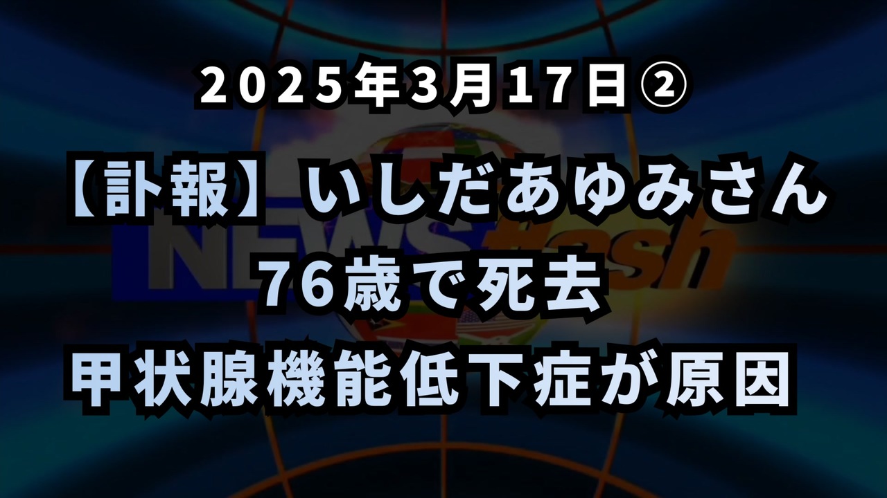 ◆ 【訃報】いしだあゆみさん死去 76歳「ブルー・ライト・ヨコハマ」が大ヒット<br><a href="https://news.yahoo.co.jp/articles/62dee020b3cc80e2f3481411acb56b66d2495d03" target="_blank" rel="noopener nofollow">https://news.yahoo.co.jp/articles/62dee020b3cc80e2f3481411acb56b66d2495d03</a><br><br><br>◆ いしだあゆみさん(76)が死去 甲状腺機能低下症のため 都内の病院で<br><a href="https://x.com/fraisst/status/1901519032681177517?t=7l4lEZLVJVFqj_yxCTlSag&s=19" target="_blank" rel="noopener nofollow">https://x.com/fraisst/status/1901519032681177517?t=7l4lEZLVJVFqj_yxCTlSag&s=19</a><br><br><br>◆ いしだあゆみさん 甲状腺機能低下症で死去 お別れ会は行わず<br><a href="https://x.com/TotalWorld1/status/1901521686132052192?t=UaSAoMtG4pvwO0XE2Jtc9Q&s=19" target="_blank" rel="noopener nofollow">https://x.com/TotalWorld1/status/1901521686132052192?t=UaSAoMtG4pvwO0XE2Jtc9Q&s=19</a><br><br><br>◆ 歌手・俳優 いしだあゆみさん死去(76)『ブルー・ライト・ヨコハマ』が大ヒット<br><a href="https://x.com/TotalWorld1/status/1901521686132052192?t=UaSAoMtG4pvwO0XE2Jtc9Q&s=19" target="_blank" rel="noopener nofollow">https://x.com/TotalWorld1/status/1901521686132052192?t=UaSAoMtG4pvwO0XE2Jtc9Q&s=19</a><br><br><br>◆ 今回の台本<br><a href="https://keiichiro8140.hatenablog.com/entry/2025/03/17/174253?_gl=1*1uxg1uj*_gcl_au*MTE0MDMyNDMzOC4xNzQyMDk5MDI2" target="_blank" rel="noopener nofollow">https://keiichiro8140.hatenablog.com/entry/2025/03/17/174253?_gl=1*1uxg1uj*_gcl_au*MTE0MDMyNDMzOC4xNzQyMDk5MDI2</a><br><br><br>いしだあゆみ<br>訃報<br>ブルーライトヨコハマ<br>日本アカデミー賞<br>甲状腺機能低下症<br>昭和歌謡<br>映画<br>追悼<br>室井慎次<br>歌手<br>女優<br><br><br />著作権、肖像権に配慮して作成しております。<br><br>◆気になったニュースの台本!?<br>メモ代わりに作った台本をそのままあげてます<br><a href="https://keiichiro8140.hatenablog.com/." target="_blank" rel="noopener nofollow">https://keiichiro8140.hatenablog.com/.</a><br><br><br>ここからはシリーズ紹介<br><br><br>◆ ワクチン解毒・デトックス<br><a href="https://x.gd/fZweg" target="_blank" rel="noopener nofollow">https://x.gd/fZweg</a><br><br>◆ウイリアム・マキス博士のがん治療(イベルメクチン・フェンベンダゾール等)<br><a href="https://x.gd/AtFYS" target="_blank" rel="noopener nofollow">https://x.gd/AtFYS</a><br><br>◆予防接種健康被害救済制度<br><a href="https://x.gd/0xK9x" target="_blank" rel="noopener nofollow">https://x.gd/0xK9x</a><br><br>◆気になったニュース #1501~<br><br>◆ 【ショートver】気になったニュース<br><a href="https://x.gd/7MxXC" target="_blank" rel="noopener nofollow">https://x.gd/7MxXC</a><br><br>◆ 気になったニュース #1001~<br><a href="https://x.gd/Lp8gv" target="_blank" rel="noopener nofollow">https://x.gd/Lp8gv</a><br><br>◆ 気になったニュース #501~<br><a href="https://x.gd/EmbS4" target="_blank" rel="noopener nofollow">https://x.gd/EmbS4</a><br><br>◆ 気になったニュース #1~#500<br><a href="https://x.gd/uPhNb" target="_blank" rel="noopener nofollow">https://x.gd/uPhNb</a><br><br>◆ X(旧Twitter)・テレグラムで気になった情報<br><a href="https://x.gd/YG6FT" target="_blank" rel="noopener nofollow">https://x.gd/YG6FT</a><br><br>◆ 日比谷5万人パレードデ⚪生放送アーカイブ動画<br><a href="https://x.gd/3CHJv" target="_blank" rel="noopener nofollow">https://x.gd/3CHJv</a><br><br>◆日比谷5万人パレード⚪モのマイリスト作ってみました<br><a href="https://nico.ms/mylist/76828848?ref=sp_other" target="_blank" rel="noopener nofollow">https://nico.ms/mylist/76828848?ref=sp_other</a><br><br>◆3.30 令和の百姓⚪⚪<br><a href="https://www.nicovideo.jp/series/511791?ref=garage_share_other" target="_blank" rel="noopener nofollow">https://www.nicovideo.jp/series/511791?ref=garage_share_other</a><br><br>◆ 及川幸久さんの【XNEWS】シリーズ<br><a href="https://x.gd/3k78K" target="_blank" rel="noopener nofollow">https://x.gd/3k78K</a><br><br>◆これまでの動画<a href="https://x.gd/sPXoJ" target="_blank" rel="noopener nofollow">https://x.gd/sPXoJ</a><br><br>◆もしも(BAN)の時のためのマイリンク集<a href="https://lit.link/K-16_News44" target="_blank" rel="noopener nofollow">https://lit.link/K-16_News44</a><br><br>