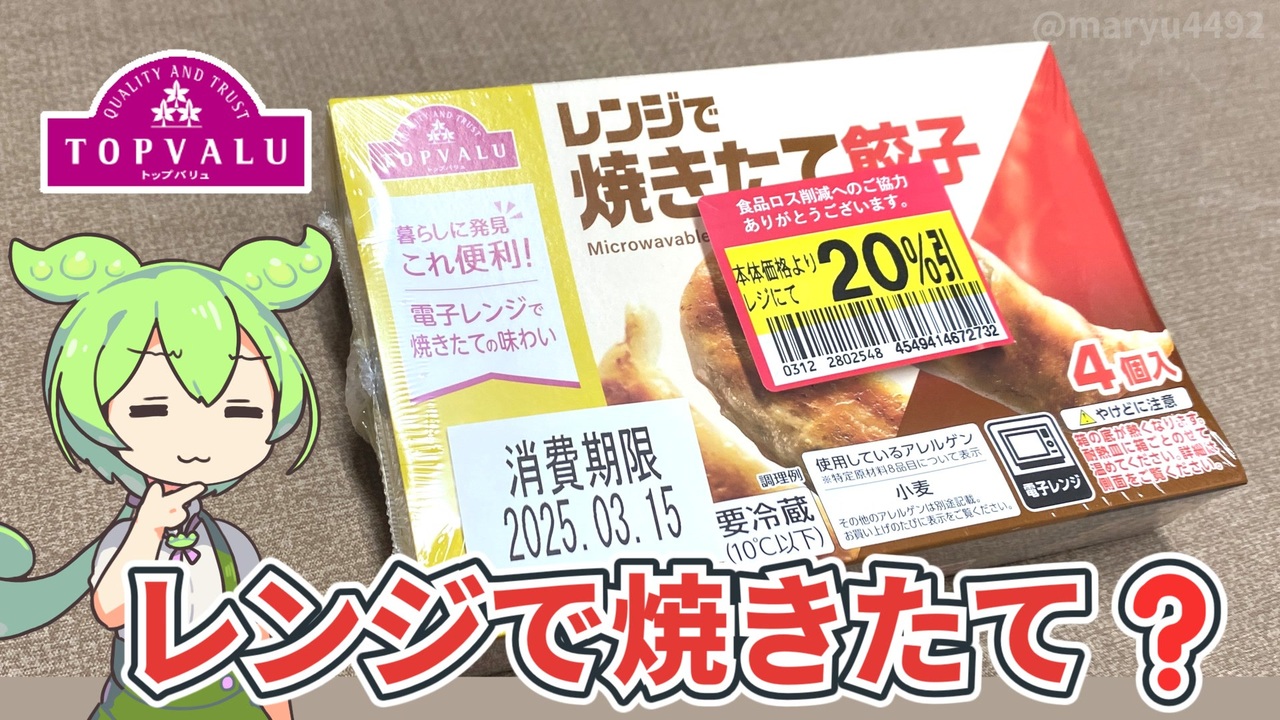 2025年3月に新発売された、トップバリュのチルドタイプのギョーザです。 <br>中にトレーがあり、灰色のシートが底に張り付けてあり <br>レンジで加熱すると、乗った面に焼き目が付くようです。 <br><br><br>【参考】 <br>レンジで焼きたて 餃子 ※本体価格198円/4個(トップバリュ) <br><a href="https://www.topvalu.net/items/detail/4549414672732/" target="_blank" rel="noopener nofollow">https://www.topvalu.net/items/detail/4549414672732/</a><br> 焼ギョーザ ※118円/5個(トップバリュ)<br> <a href="https://www.topvalu.net/items/detail/4549741630573/" target="_blank" rel="noopener nofollow">https://www.topvalu.net/items/detail/4549741630573/</a> <br>「トップバリュ レンジで焼きたて 餃子」などを新発売 2025.03.06(PR TIMES) <br><a href="https://prtimes.jp/main/html/rd/p/000004931.000007505.html" target="_blank" rel="noopener nofollow">https://prtimes.jp/main/html/rd/p/000004931.000007505.html</a><br> レンジでギョーザ ※実売価格318円/10個(味の素) <br><a href="https://www.ffa.ajinomoto.com/products/detail/id/353" target="_blank" rel="noopener nofollow">https://www.ffa.ajinomoto.com/products/detail/id/353</a> <br>株式会社邑来食品(SalesNow) <br><a href="https://salesnow.jp/db/companies/jcbax3476wvbnp6w" target="_blank" rel="noopener nofollow">https://salesnow.jp/db/companies/jcbax3476wvbnp6w</a><br> ダイヘイグループ <br><a href="https://www.taiheig.co.jp/" target="_blank" rel="noopener nofollow">https://www.taiheig.co.jp/</a> <br>ユーフーズ株式会社 <br><a href="https://ufoods.co.jp/" target="_blank" rel="noopener nofollow">https://ufoods.co.jp/</a><br><br>【使用した素材】(※敬称略) <br>(合成音声)VOICEVOX/ずんだもん/四国めたん <br><a href="https://voicevox.hiroshiba.jp/" target="_blank" rel="noopener nofollow">https://voicevox.hiroshiba.jp/</a> <br>(立ち絵)坂本アヒル <br><a href="https://seiga.nicovideo.jp/seiga/im10788496?track" target="_blank" rel="noopener nofollow">https://seiga.nicovideo.jp/seiga/im10788496?track</a> <br>(楽曲)甘茶の音楽工房/「楽しい麦畑」「フルーツパフェ」「お城の舞踏会」 <br><a href="https://amachamusic.chagasi.co" target="_blank" rel="noopener nofollow">https://amachamusic.chagasi.co</a>