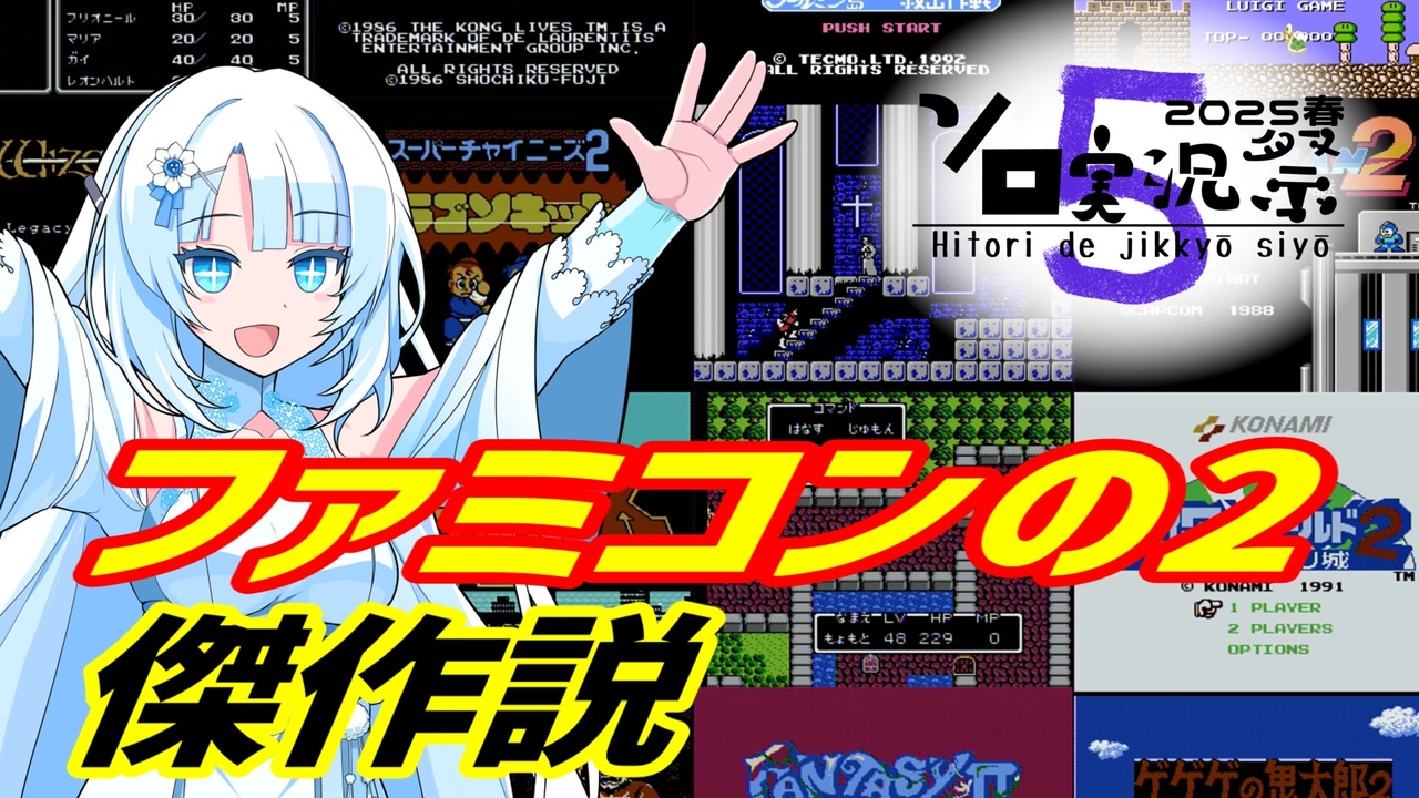 ねなし様主催の第5回ボイスソフトキャラクター ソロ実況祭に参加させていただきました。<br>今回の動画は2がつくファミコンソフトの紹介です。<br><br>お借りした素材<br><br>WhiteCUL立ち絵素材(moiky様)/<a href="https://seiga.nicovideo.jp/seiga/im11047926" target="_blank" rel="noopener">im11047926</a><br>ニコニ・コモンズ様<br><br>VOICEVOX WhiteCUL<br><br>スーパーマリオブラザーズ2(1986・任天堂)<br>ロックマン2 Dr.ワイリーの謎(1988・カプコン)<br>Castlevania 2:Simon's Quest(1988・コナミ)<br>ワイワイワールド2 SOS!! パセリ城(1991・コナミ)<br>スペランカー2 勇者への挑戦(1987・アイレム)<br>スパルタンX2(1991・アイレム)<br>ソロモンの鍵2クールミン島救出作戦(1992・テクモ)<br>キングコング2 怒りのメガトンパンチ(1986・コナミ)<br>ドラゴンクエスト2 悪霊の神々(1987・エニックス)<br>ファイナルファンタジー2(1988・スクウェア)<br>ゲゲゲの鬼太郎2 妖怪軍団の挑戦(1987・バンダイ)<br>SDガンダム ガチャポン戦士2 カプセル戦記(1989・新生工業)<br>イース2(1990・日本ファルコム、ビクター音楽産業)<br>スーパーチャイニーズ2 ドラゴンキッド(1989・カルチャーブレーン)<br>ファンタジーゾーン2 オパオパの涙(1988・セガ)<br>ウィザードリィ2 リルガミンの遺産(1989・アスキー)