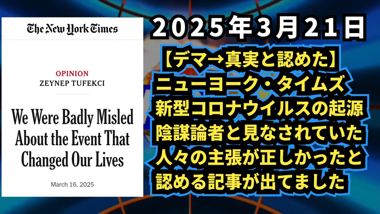 【デマ→真実と認めた】ニューヨーク・タイムズ 新型コロナウイルスの起源 陰謀論者と見なされていた人々の主張が正しかったと認める<br><br><br>◆ NYTが認めた!コロナ陰謀論は真実だった?ファウチらの隠ぺいとは <a href="https://x.com/Junika2022/status/1902725888078500109?t=1y63HbxAX4bLrKt6upf_tg&s=19" target="_blank" rel="noopener nofollow">https://x.com/Junika2022/status/1902725888078500109?t=1y63HbxAX4bLrKt6upf_tg&s=19</a><br><br>◆ ニューヨーク・タイムズが報じた「コロナ誤情報」検閲の実態 <a href="https://x.com/i/grok/share/csTO9R7yxa8xhiYQv6TCgsDgW" target="_blank" rel="noopener nofollow">https://x.com/i/grok/share/csTO9R7yxa8xhiYQv6TCgsDgW</a><br><br>◆ ニューヨーク・タイムズ<br>私たちの人生を変えた出来事について、私たちはひどく誤解していた 2025年3月16日<br><a href="https://www.nytimes.com/2025/03/16/opinion/covid-pandemic-lab-leak.html" target="_blank" rel="noopener nofollow">https://www.nytimes.com/2025/03/16/opinion/covid-pandemic-lab-leak.html</a><br><br><br>◆ 今回の台本<br><a href="https://keiichiro8140.hatenablog.com/entry/20250321002" target="_blank" rel="noopener nofollow">https://keiichiro8140.hatenablog.com/entry/20250321002</a><br><br><br>コロナ<br>NYT<br>検閲<br>ファウチ<br>漏洩<br>バイデン<br>SNS<br>メディア<br>情報統制<br>陰謀<br>武漢<br><br><br />著作権、肖像権に配慮して作成しております。<br><br>◆気になったニュースの台本!?<br>メモ代わりに作った台本をそのままあげてます<br><a href="https://keiichiro8140.hatenablog.com/." target="_blank" rel="noopener nofollow">https://keiichiro8140.hatenablog.com/.</a><br><br><br>ここからはシリーズ紹介<br><br><br>◆ ワクチン解毒・デトックス<br><a href="https://x.gd/fZweg" target="_blank" rel="noopener nofollow">https://x.gd/fZweg</a><br><br>◆ウイリアム・マキス博士のがん治療(イベルメクチン・フェンベンダゾール等)<br><a href="https://x.gd/AtFYS" target="_blank" rel="noopener nofollow">https://x.gd/AtFYS</a><br><br>◆予防接種健康被害救済制度<br><a href="https://x.gd/0xK9x" target="_blank" rel="noopener nofollow">https://x.gd/0xK9x</a><br><br>◆気になったニュース #1501~<br><br>◆ 【ショートver】気になったニュース<br><a href="https://x.gd/7MxXC" target="_blank" rel="noopener nofollow">https://x.gd/7MxXC</a><br><br>◆ 気になったニュース #1001~<br><a href="https://x.gd/Lp8gv" target="_blank" rel="noopener nofollow">https://x.gd/Lp8gv</a><br><br>◆ 気になったニュース #501~<br><a href="https://x.gd/EmbS4" target="_blank" rel="noopener nofollow">https://x.gd/EmbS4</a><br><br>◆ 気になったニュース #1~#500<br><a href="https://x.gd/uPhNb" target="_blank" rel="noopener nofollow">https://x.gd/uPhNb</a><br><br>◆ X(旧Twitter)・テレグラムで気になった情報<br><a href="https://x.gd/YG6FT" target="_blank" rel="noopener nofollow">https://x.gd/YG6FT</a><br><br>◆ 日比谷5万人パレードデ⚪生放送アーカイブ動画<br><a href="https://x.gd/3CHJv" target="_blank" rel="noopener nofollow">https://x.gd/3CHJv</a><br><br>◆日比谷5万人パレード⚪モのマイリスト作ってみました<br><a href="https://nico.ms/mylist/76828848?ref=sp_other" target="_blank" rel="noopener nofollow">https://nico.ms/mylist/76828848?ref=sp_other</a><br><br>◆3.30 令和の百姓⚪⚪<br><a href="https://www.nicovideo.jp/series/511791?ref=garage_share_other" target="_blank" rel="noopener nofollow">https://www.nicovideo.jp/series/511791?ref=garage_share_other</a><br><br>◆ 及川幸久さんの【XNEWS】シリーズ<br><a href="https://x.gd/3k78K" target="_blank" rel="noopener nofollow">https://x.gd/3k78K</a><br><br>◆これまでの動画<a href="https://x.gd/sPXoJ" target="_blank" rel="noopener nofollow">https://x.gd/sPXoJ</a><br><br>◆もしも(BAN)の時のためのマイリンク集<a href="https://lit.link/K-16_News44" target="_blank" rel="noopener nofollow">https://lit.link/K-16_News44</a><br><br>
