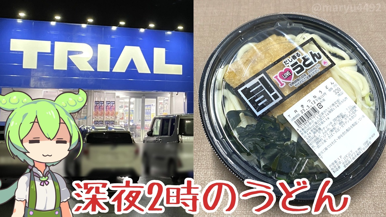 眠れないので24時間営業のトライアルに行ってきました。<br><br><br>【関連動画】 <br>驚きの白さ!ファミリーマートの「大盛りかけうどん(399円)」2025.02.11<br><a href="https://www.nicovideo.jp/watch/sm44625276" target="_blank" rel="noopener nofollow">https://www.nicovideo.jp/watch/sm44625276</a><br><br>【前回のトライアル】 <br>トライアルの「簡単に手で皮がむけるおいしいオレンジ(税込み499円/6個)2025.03.14<br><a href="https://www.nicovideo.jp/watch/sm44759358" target="_blank" rel="noopener nofollow">https://www.nicovideo.jp/watch/sm44759358</a><br><br>【参考】 <br>トライアル <br><a href="https://www.trial-net.co.jp/" target="_blank" rel="noopener nofollow">https://www.trial-net.co.jp/</a> <br>中京CTデリカ株式会社 <br><a href="http://chukyo-ct.co.jp/" target="_blank" rel="noopener nofollow">http://chukyo-ct.co.jp/</a> <br><br>【使用した素材】(※敬称略) <br>(合成音声)VOICEVOX/ずんだもん<br> <a href="https://voicevox.hiroshiba.jp/" target="_blank" rel="noopener nofollow">https://voicevox.hiroshiba.jp/</a> <br>(立ち絵)坂本アヒル<br> <a href="https://seiga.nicovideo.jp/seiga/im10788496?track" target="_blank" rel="noopener nofollow">https://seiga.nicovideo.jp/seiga/im10788496?track</a><br> (楽曲)甘茶の音楽工房/「7月の木漏れ日」<br> <a href="https://amachamusic.chagasi.co" target="_blank" rel="noopener nofollow">https://amachamusic.chagasi.co</a>