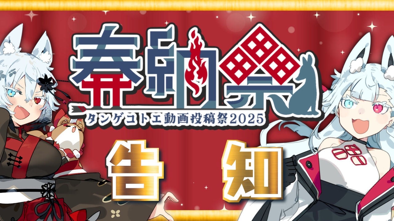 <strong>タンゲコトエ投稿祭、通称「奉納祭2025」、やるぞおお!</strong><br><br><strong><i>【追記】<br>一部2024になってました!!本当にすまん!直しました!</i></strong><br><strong>【さらに追記】<br>UTAUタンゲコトエでの参加も大歓迎です!</strong><br><br>【奉納祭2025ロゴ配布】<br><a href="https://tangekotoe.booth.pm/items/6734509" target="_blank" rel="noopener nofollow">https://tangekotoe.booth.pm/items/6734509</a><br>【2024狐おろし】<br><a href="https://youtube.com/live/4W9WU2x1vV4" target="_blank" rel="noopener nofollow">https://youtube.com/live/4W9WU2x1vV4</a><br><br>【奉納祭2025概要】<br>●奉納祭部門について<br>「動画」「静画」2部門制、各部門投稿可能本数は7作品までです。<br><br>●参加方法(両部門)<br>ニコニコで作品を投稿するとことで参加となります。<br>開催期間中タグ「タンゲコトエ奉納祭2025」をつけることで参加となります。<br>※Youtubeなどへ投稿して頂く事は可能ですが、集計には含まれません。<br>※タグに使用する数字は半角でお願いします。<br>他企画や投稿祭への同時参加も可能です。<br><br>●賞について<br>▼まろの独断と偏見で大好きで賞<br>丹下琴絵が独断と偏見で選んだ好きな作品に贈られます。<br>「家庭用消火器1個&アクリルトロフィー&奉納祭オリジナルグッズ&熊本お土産セット」が贈呈されます。<br><br>▼母上賞<br>母上が独断と偏見で選んだ好きな作品に贈られます。<br>「母上が選ぶ熊本のおかん仕送りセット&奉納祭オリジナルグッズ」が贈呈されます。<br><br>▼静画賞<br>丹下琴絵が独断と偏見で選んだ好きな作品に贈られます。<br>「アクリルトロフィー&奉納祭オリジナルグッズ&熊本お土産セット」が贈呈されます。<br><br>▼参加賞<br>奉納祭へ参加しており、希望するすべての投稿者様に贈られます。<br>希望する場合、投稿者様の本人確認のため、<br>・ニコニコガレージ<br>・静画マイページ<br>のスクショを添付の上、送付先住所などをお送りいただきます。<br><a href="https://forms.gle/k7v1vto2dtdyPSeR7" target="_blank" rel="noopener nofollow">https://forms.gle/k7v1vto2dtdyPSeR7</a><br><br>●狐おろしについて<br>奉納祭の総まとめ生配信です。<br>時間の許す限り、投稿された動画の紹介や、賞の受賞者発表などを行う予定となっています。<br>Youtube、ニコニコ生放送にて同時配信予定です。<br><br>●開催期間<br>奉納祭 5/18(日)~5/24(土)<br>狐おろし7月20日(日)に延期となりました<br><br><a target="_blank" href="https://qa.nicovideo.jp/faq/show/19424?site_domain=default" style="font-size: 13px;color: #657586; text-decoration: underline; line-height: 1.4">この動画は投稿者によって修正されました</a>