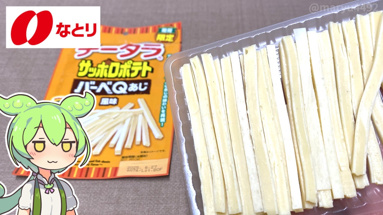 2025年2月にコンビニで先行発売され、3月にスーパー等で販売が始まった <br>なとりのチータラ、サッポロポテトバーベQあじ風味です。 <br>前にピザポテト味を食べたのですが <br>なかなかの仕上がりだったので期待が高まります。<br><br><br>【関連動画】 <br>なとりの「チータラ ピザポテト味」2023.11.14<br><a href="https://www.nicovideo.jp/watch/sm43012872" target="_blank" rel="noopener nofollow">https://www.nicovideo.jp/watch/sm43012872</a><br><br>【参考】 <br>なとり×カルビーのコラボフレーバーが新登場!2025.01.31(PR TIMES) <br><a href="https://prtimes.jp/main/html/rd/p/000000031.000127928.html" target="_blank" rel="noopener nofollow">https://prtimes.jp/main/html/rd/p/000000031.000127928.html</a><br><br>【使用した素材】(※敬称略) <br>(合成音声)VOICEVOX/ずんだもん/四国めたん <br><a href="https://voicevox.hiroshiba.jp/" target="_blank" rel="noopener nofollow">https://voicevox.hiroshiba.jp/</a> <br>(立ち絵)坂本アヒル <br><a href="https://seiga.nicovideo.jp/seiga/m10788496/im10791276" target="_blank" rel="noopener nofollow">https://seiga.nicovideo.jp/seiga/m10788496/im10791276</a> <br>(楽曲)甘茶の音楽工房/「日々是好日」「残業戦士」 <br><a href="https://amachamusic.chagasi.com" target="_blank" rel="noopener nofollow">https://amachamusic.chagasi.com</a>
