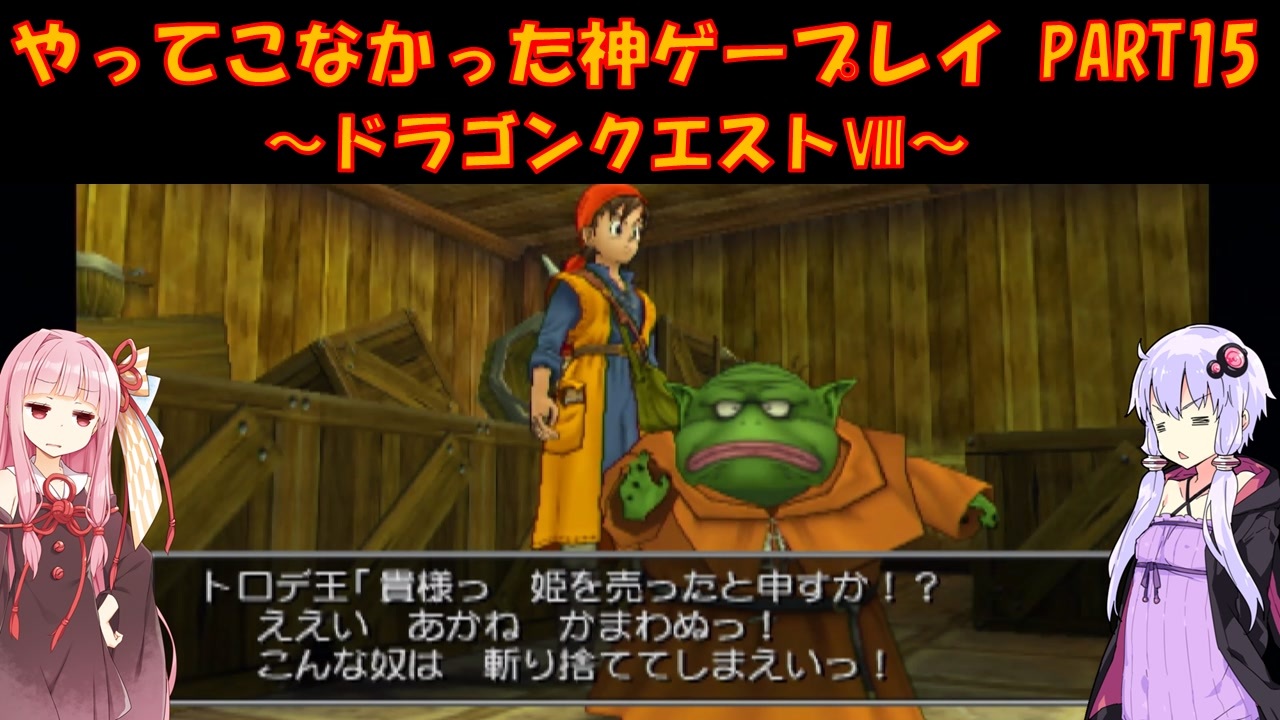 PS2版 ドラゴンクエストⅧをプレイ<br>ゆかりさんはメジャーじゃないゲームをやる俺カッケー族だったのでドラクエをやったことがありませんでした(DSのⅤ以外)<br><br>ゆ:姫が汚いおっさんに売られてしまった、何も起きないはずもなく<br>茜:馬やで?<br><br>PART1:<a href="https://www.nicovideo.jp/watch/sm44676588" target="_blank" rel="noopener nofollow">https://www.nicovideo.jp/watch/sm44676588</a><br><br>各DQシリーズ第1回リンク<br>DQ1:<a href="https://www.nicovideo.jp/watch/sm41819145" target="_blank" rel="noopener nofollow">https://www.nicovideo.jp/watch/sm41819145</a><br>DQ2:<a href="https://www.nicovideo.jp/watch/sm41895278" target="_blank" rel="noopener nofollow">https://www.nicovideo.jp/watch/sm41895278</a><br>DQ3:<a href="https://www.nicovideo.jp/watch/sm42034398" target="_blank" rel="noopener nofollow">https://www.nicovideo.jp/watch/sm42034398</a><br>DQ4:<a href="https://www.nicovideo.jp/watch/sm42520974" target="_blank" rel="noopener nofollow">https://www.nicovideo.jp/watch/sm42520974</a><br>DQ5:<a href="https://www.nicovideo.jp/watch/sm42848575" target="_blank" rel="noopener nofollow">https://www.nicovideo.jp/watch/sm42848575</a><br>DQ6:<a href="https://www.nicovideo.jp/watch/sm43080264" target="_blank" rel="noopener nofollow">https://www.nicovideo.jp/watch/sm43080264</a><br>DQ7:<a href="https://www.nicovideo.jp/watch/sm43851863" target="_blank" rel="noopener nofollow">https://www.nicovideo.jp/watch/sm43851863</a><br>DQM1:<a href="https://www.nicovideo.jp/watch/sm43525709" target="_blank" rel="noopener nofollow">https://www.nicovideo.jp/watch/sm43525709</a><br>DQMCH:<a href="https://www.nicovideo.jp/watch/sm44443421" target="_blank" rel="noopener nofollow">https://www.nicovideo.jp/watch/sm44443421</a><br><br>動画内で使用させていただいた素材<br>【イラスト】<br>結月ゆかり→ペテン師様:<a href="https://seiga.nicovideo.jp/seiga/im5494168" target="_blank" rel="noopener nofollow">https://seiga.nicovideo.jp/seiga/im5494168</a><br>琴葉茜→ユメのオワリ様:<a href="https://seiga.nicovideo.jp/seiga/im10706241" target="_blank" rel="noopener nofollow">https://seiga.nicovideo.jp/seiga/im10706241</a><br><br>【音声】<br>A.I.Voice:琴葉茜<br><a href="https://aivoice.jp/product/kotonoha/" target="_blank" rel="noopener nofollow">https://aivoice.jp/product/kotonoha/</a><br><br>A.I.Voice:結月ゆかり<br><a href="https://aivoice.jp/product/yukari/" target="_blank" rel="noopener nofollow">https://aivoice.jp/product/yukari/</a><br><br>この動画で利用している株式会社スクウェア・エニックスを代表とする共同著作者が権利を所有する著作物及びスギヤマ工房有限会社が権利を所有する楽曲の転載・配布は禁止いたします。<br>© 2004 ARMOR PROJECT/BIRD STUDIO/LEVEL-5/SQUARE ENIX All Rights Reserved.<br>© SUGIYAMA KOBO