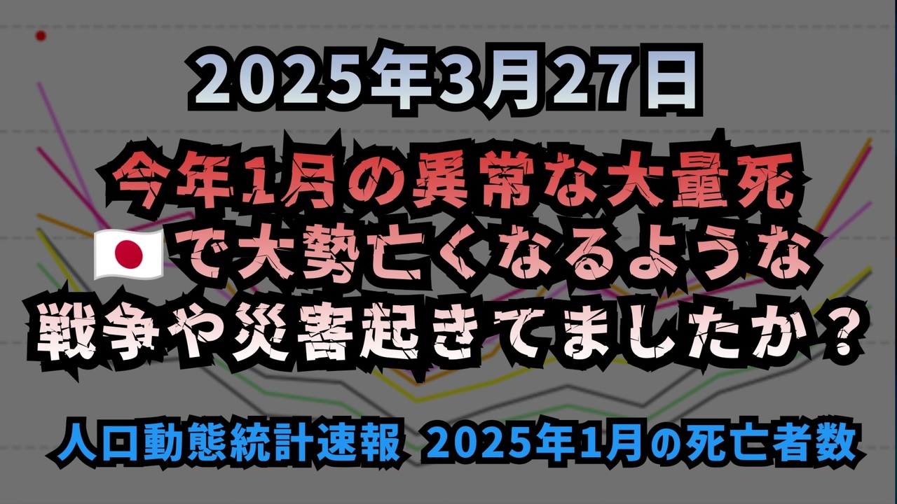2025年1月、日本の死亡者数が異常な増加を記録しました。厚生労働省の最新データによると、前年同月比で13.9%増加し、超過死亡は2.7万人に達しています。これは、東日本大震災時の超過死亡を超える規模です。<br><br>グラフからは、2020年以降の死亡者数の増加傾向が明確になっており、特に冬場の死亡率が急上昇しています。厚生労働省の発表によると「現時点で把握していない」とのことですが、この異常な増加の背景には何があるのでしょうか?日本社会はどのように向き合うべきなのか、詳しく見ていきます。<br><br><br>◆ 今回の台本<br><a href="https://keiichiro8140.hatenablog.com/entry/20250327001" target="_blank" rel="noopener nofollow">https://keiichiro8140.hatenablog.com/entry/20250327001</a><br><br><br>2025年1月の死亡数<br>超過死亡<br>人口動態統計<br>厚生労働省<br>日本の死亡率<br>異常な<br>人口減少<br>福岡厚労相<br>3.11<br>東日本大震災比較<br>謎の大量死<br><br><br />著作権、肖像権に配慮して作成しております。<br><br>◆気になったニュースの台本!?<br>メモ代わりに作った台本をそのままあげてます<br><a href="https://keiichiro8140.hatenablog.com/." target="_blank" rel="noopener nofollow">https://keiichiro8140.hatenablog.com/.</a><br><br><br>ここからはシリーズ紹介<br><br><br>◆ ワクチン解毒・デトックス<br><a href="https://x.gd/fZweg" target="_blank" rel="noopener nofollow">https://x.gd/fZweg</a><br><br>◆ウイリアム・マキス博士のがん治療(イベルメクチン・フェンベンダゾール等)<br><a href="https://x.gd/AtFYS" target="_blank" rel="noopener nofollow">https://x.gd/AtFYS</a><br><br>◆予防接種健康被害救済制度<br><a href="https://x.gd/0xK9x" target="_blank" rel="noopener nofollow">https://x.gd/0xK9x</a><br><br>◆気になったニュース #1501~<br><br>◆ 【ショートver】気になったニュース<br><a href="https://x.gd/7MxXC" target="_blank" rel="noopener nofollow">https://x.gd/7MxXC</a><br><br>◆ 気になったニュース #1001~<br><a href="https://x.gd/Lp8gv" target="_blank" rel="noopener nofollow">https://x.gd/Lp8gv</a><br><br>◆ 気になったニュース #501~<br><a href="https://x.gd/EmbS4" target="_blank" rel="noopener nofollow">https://x.gd/EmbS4</a><br><br>◆ 気になったニュース #1~#500<br><a href="https://x.gd/uPhNb" target="_blank" rel="noopener nofollow">https://x.gd/uPhNb</a><br><br>◆ X(旧Twitter)・テレグラムで気になった情報<br><a href="https://x.gd/YG6FT" target="_blank" rel="noopener nofollow">https://x.gd/YG6FT</a><br><br>◆ 日比谷5万人パレードデ⚪生放送アーカイブ動画<br><a href="https://x.gd/3CHJv" target="_blank" rel="noopener nofollow">https://x.gd/3CHJv</a><br><br>◆日比谷5万人パレード⚪モのマイリスト作ってみました<br><a href="https://nico.ms/mylist/76828848?ref=sp_other" target="_blank" rel="noopener nofollow">https://nico.ms/mylist/76828848?ref=sp_other</a><br><br>◆3.30 令和の百姓⚪⚪<br><a href="https://www.nicovideo.jp/series/511791?ref=garage_share_other" target="_blank" rel="noopener nofollow">https://www.nicovideo.jp/series/511791?ref=garage_share_other</a><br><br>◆ 及川幸久さんの【XNEWS】シリーズ<br><a href="https://x.gd/3k78K" target="_blank" rel="noopener nofollow">https://x.gd/3k78K</a><br><br>◆これまでの動画<a href="https://x.gd/sPXoJ" target="_blank" rel="noopener nofollow">https://x.gd/sPXoJ</a><br><br>◆もしも(BAN)の時のためのマイリンク集<a href="https://lit.link/K-16_News44" target="_blank" rel="noopener nofollow">https://lit.link/K-16_News44</a><br><br>