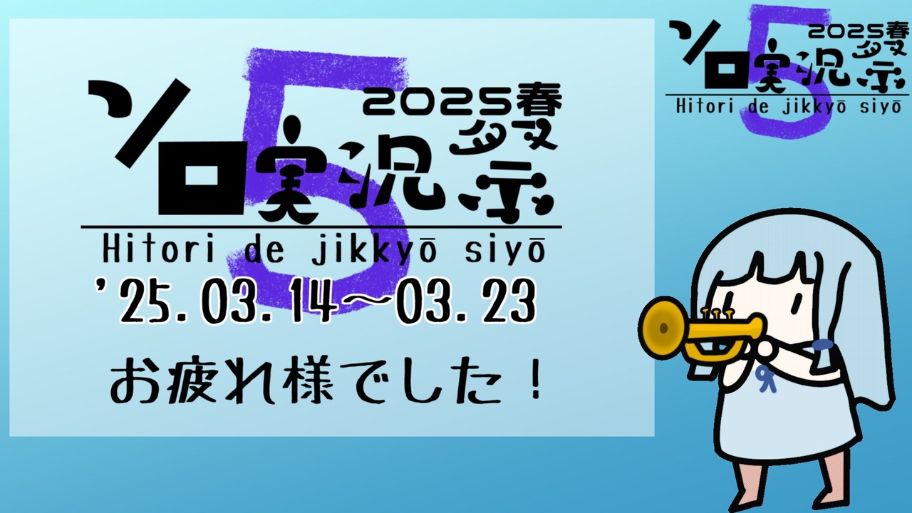 第5回ボイスソフトキャラクター ソロ実況祭(3月14日~3月23日)にご参加いただき、ありがとうございました!<br><br><span style="font-size: 18px;"><strong>[参加動画リスト]<br>前半 <a href="https://www.nicovideo.jp/mylist/77871035" target="_blank" rel="noopener">mylist/77871035</a><br>後半 <a href="https://www.nicovideo.jp/mylist/77904119" target="_blank" rel="noopener">mylist/77904119</a> </strong></span><br><br>【視聴会予定】<br>第1回 3月28日(金)<br>第2回 3月29日(土) <br>第3回 4月2日(水) <br>第4回 4月3日(木)<br>第5回 4月4日(金) <br>第6回 4月5日(土)<br>※各20時30分から<br><br>【次回予定】<br><s>9月13日(土) ~ 9月23日(火)秋分の日</s><br>延期いたします: <a href="https://www.nicovideo.jp/watch/sm45049229" class="watch">sm45049229</a><br><br>連絡先X<br><a href="https://x.com/vsc_solo_fes" target="_blank" rel="noopener nofollow">https://x.com/vsc_solo_fes</a><br><br>[追記]<br>過去のソロ実況祭にて悪質な違反行為を行った人物の別アカウントによるものと思われる動画を参加動画リストから削除しました。<br>参加人数は367名、参加動画数は581本に訂正いたします。