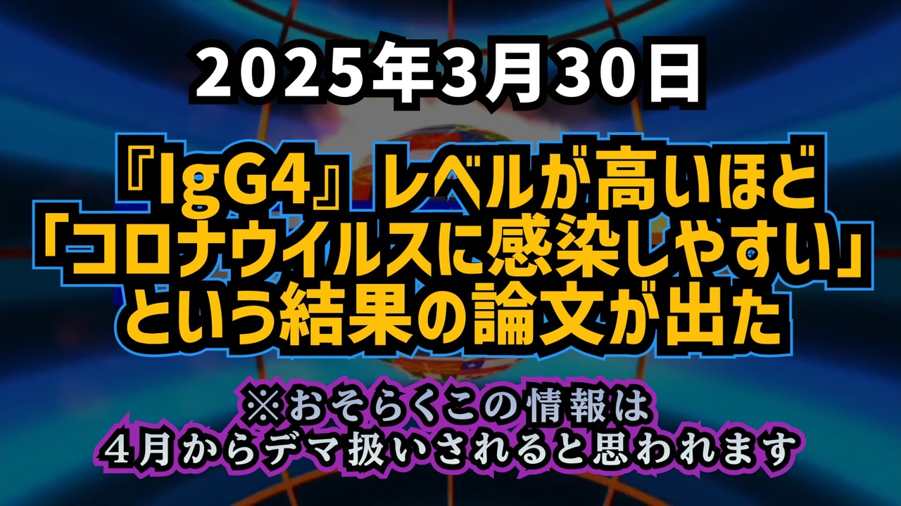 新型コロナウイルスに対するmRNAワクチン接種後、一部の人々でIgG4抗体の増加が報告されています。<br>IgG4は通常、アレルギー反応の抑制に関与する抗体ですが、その異常な増加が免疫システムにどのような影響を及ぼすのか、最新の研究結果をもとに解説します。<br><br>この動画では、IgG4の役割、ワクチン接種後の免疫応答の変化、そしてこれらが新型コロナウイルスへの感染リスクや重症化リスクにどのように関連するのかを探ります。<br>さらに、ワクチン接種の長期的な影響や、免疫システムのバランスについても考察します。<br><br>視聴者の皆様が自身の健康とワクチン接種に関する情報を理解し、適切な判断を下すための一助となることを目指します。<br><br><br>◆ 今回の台本<br><a href="https://keiichiro8140.hatenablog.com/entry/20250330001" target="_blank" rel="noopener nofollow">https://keiichiro8140.hatenablog.com/entry/20250330001</a><br><br><br>新型コロナワクチン<br>IgG4<br>免疫応答<br>自己免疫疾患<br>ワクチン副反応<br>スパイクタンパク<br>mRNAワクチン<br>抗体<br>免疫システム<br>ワクチン<br>ニュース<br><br><br />著作権、肖像権に配慮して作成しております。<br><br>◆気になったニュースの台本!?<br>メモ代わりに作った台本をそのままあげてます<br><a href="https://keiichiro8140.hatenablog.com/." target="_blank" rel="noopener nofollow">https://keiichiro8140.hatenablog.com/.</a><br><br><br>ここからはシリーズ紹介<br><br><br>◆ ワクチン解毒・デトックス<br><a href="https://x.gd/fZweg" target="_blank" rel="noopener nofollow">https://x.gd/fZweg</a><br><br>◆ウイリアム・マキス博士のがん治療(イベルメクチン・フェンベンダゾール等)<br><a href="https://x.gd/AtFYS" target="_blank" rel="noopener nofollow">https://x.gd/AtFYS</a><br><br>◆予防接種健康被害救済制度<br><a href="https://x.gd/0xK9x" target="_blank" rel="noopener nofollow">https://x.gd/0xK9x</a><br><br>◆気になったニュース #1501~<br><br>◆ 【ショートver】気になったニュース<br><a href="https://x.gd/7MxXC" target="_blank" rel="noopener nofollow">https://x.gd/7MxXC</a><br><br>◆ 気になったニュース #1001~<br><a href="https://x.gd/Lp8gv" target="_blank" rel="noopener nofollow">https://x.gd/Lp8gv</a><br><br>◆ 気になったニュース #501~<br><a href="https://x.gd/EmbS4" target="_blank" rel="noopener nofollow">https://x.gd/EmbS4</a><br><br>◆ 気になったニュース #1~#500<br><a href="https://x.gd/uPhNb" target="_blank" rel="noopener nofollow">https://x.gd/uPhNb</a><br><br>◆ X(旧Twitter)・テレグラムで気になった情報<br><a href="https://x.gd/YG6FT" target="_blank" rel="noopener nofollow">https://x.gd/YG6FT</a><br><br>◆ 日比谷5万人パレードデ⚪生放送アーカイブ動画<br><a href="https://x.gd/3CHJv" target="_blank" rel="noopener nofollow">https://x.gd/3CHJv</a><br><br>◆日比谷5万人パレード⚪モのマイリスト作ってみました<br><a href="https://nico.ms/mylist/76828848?ref=sp_other" target="_blank" rel="noopener nofollow">https://nico.ms/mylist/76828848?ref=sp_other</a><br><br>◆3.30 令和の百姓⚪⚪<br><a href="https://www.nicovideo.jp/series/511791?ref=garage_share_other" target="_blank" rel="noopener nofollow">https://www.nicovideo.jp/series/511791?ref=garage_share_other</a><br><br>◆ 及川幸久さんの【XNEWS】シリーズ<br><a href="https://x.gd/3k78K" target="_blank" rel="noopener nofollow">https://x.gd/3k78K</a><br><br>◆これまでの動画<a href="https://x.gd/sPXoJ" target="_blank" rel="noopener nofollow">https://x.gd/sPXoJ</a><br><br>◆もしも(BAN)の時のためのマイリンク集<a href="https://lit.link/K-16_News44" target="_blank" rel="noopener nofollow">https://lit.link/K-16_News44</a><br><br>