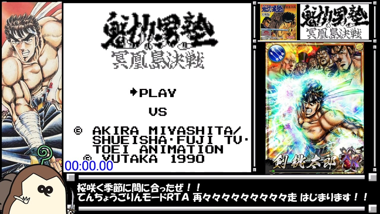 やっと出ました!うれしいです!<br><br>7分30秒は間違いなく切れますが、それがいつ出るかは・・・もうわかんねぇな!<br>男塾ソシャゲやりながら待っててね!<br><br><プレイ環境や条件><br>レトロフリークにてプレイ<br><br>タイマーは録画した動画に編集で追加したものです<br><br>タイマースタート:『てんちょうごりんモード』を選択した瞬間<br>タイマーストップ:『完』の文字が出切った瞬間<br><br><動画作成でお世話になりました><br>魁!!男塾 作者:宮下あきら様<br> <a href="https://www.s-manga.net/items/contents.html?isbn=4-08-617521-5" target="_blank" rel="noopener nofollow">https://www.s-manga.net/items/contents.html?isbn=4-08-617521-5</a><br> <a href="https://www.nihonbungeisha.co.jp/goraku/otokojuku/" target="_blank" rel="noopener nofollow">https://www.nihonbungeisha.co.jp/goraku/otokojuku/</a><br><br>ソーシャルゲーム 魁!!男塾~連合大闘争編~<br> <a href="https://www.visualize.co.jp/business/game/" target="_blank" rel="noopener nofollow">https://www.visualize.co.jp/business/game/</a><br><br>VOICEVOX:WhiteCUL<br> <a href="https://voicevox.hiroshiba.jp/" target="_blank" rel="noopener nofollow">https://voicevox.hiroshiba.jp/</a><br> <a href="https://www.whitecul.com/" target="_blank" rel="noopener nofollow">https://www.whitecul.com/</a><br><br>左下 キュイ族 マチャーのイラスト:知り合いの絵師FJWRRY様<br> ※キュイ族:ゼルダの伝説 スカイウォードソードに登場する草食亜人<br><br><過去のRTA動画><br>【初】<a href="https://www.nicovideo.jp/watch/sm44038010" class="watch">sm44038010</a><br>【再走】<a href="https://www.nicovideo.jp/watch/sm44048854" class="watch">sm44048854</a><br>【再々走】<a href="https://www.nicovideo.jp/watch/sm44065747" class="watch">sm44065747</a><br>【再々々走】<a href="https://www.nicovideo.jp/watch/sm44090912" class="watch">sm44090912</a><br>【再々々々走】<a href="https://www.nicovideo.jp/watch/sm44135185" class="watch">sm44135185</a><br>【再々々々々走】<a href="https://www.nicovideo.jp/watch/sm44161616" class="watch">sm44161616</a><br>【再々々々々々走】<a href="https://www.nicovideo.jp/watch/sm44229688" class="watch">sm44229688</a><br>【再々々々々々々走】<a href="https://www.nicovideo.jp/watch/sm44352376" class="watch">sm44352376</a><br>【再々々々々々々々走】<a href="https://www.nicovideo.jp/watch/sm44494593" class="watch">sm44494593</a><br>【再々々々々々々々々走】<a href="https://www.nicovideo.jp/watch/sm44614961" class="watch">sm44614961</a><br><br><小ネタ動画><br>【パスワード第一弾】<a href="https://www.nicovideo.jp/watch/sm44178271" class="watch">sm44178271</a><br>【パスワード第二弾】<a href="https://www.nicovideo.jp/watch/sm44204226" class="watch">sm44204226</a><br>【パスワード第三弾】<a href="https://www.nicovideo.jp/watch/sm44288987" class="watch">sm44288987</a><br>【助っ人であーるっ!】<a href="https://www.nicovideo.jp/watch/sm44402195" class="watch">sm44402195</a>