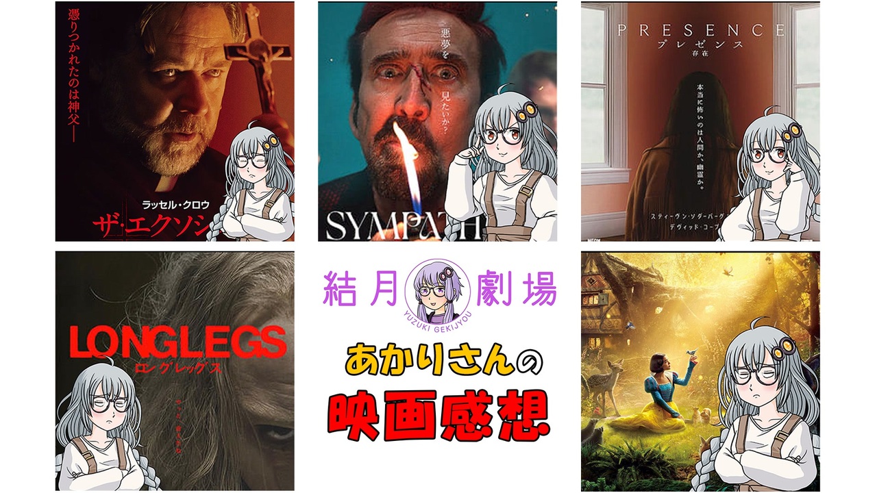 ゆかりさんに勧められた映画を見たあかりさんの感想です<br><br>※先にゆかりさんの紹介動画を見ることをお勧めします<br><br>・ザ・エクソシズム:<a href="https://www.nicovideo.jp/watch/sm44701442" class="watch">sm44701442</a><br>・シンパシー・フォー・ザ・デビル:<a href="https://www.nicovideo.jp/watch/sm44712764" class="watch">sm44712764</a><br>・プレゼンス 存在:<a href="https://www.nicovideo.jp/watch/sm44738371" class="watch">sm44738371</a><br>・ロングレッグス:<a href="https://www.nicovideo.jp/watch/sm44780898" class="watch">sm44780898</a><br>・白雪姫:<a href="https://www.nicovideo.jp/watch/sm44794827" class="watch">sm44794827</a><br><br><br>結月さんの映画紹介YouTubeチャンネル<br><a href="https://www.youtube.com/@YuzukiGekijyou" target="_blank" rel="noopener nofollow">https://www.youtube.com/@YuzukiGekijyou</a><br>