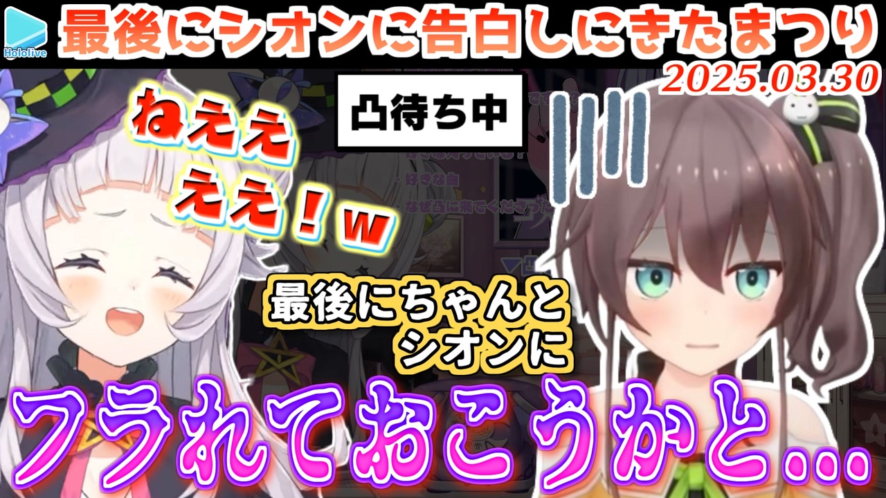 <a href="#" class="seekTime" data-seekTime="00:00" onclick="seekNicoPlayer('#00:00'); return false;">#00:00</a> まつり<br><a href="#" class="seekTime" data-seekTime="04:18" onclick="seekNicoPlayer('#04:18'); return false;">#04:18</a> ポルカっちょ<br><a href="#" class="seekTime" data-seekTime="05:49" onclick="seekNicoPlayer('#05:49'); return false;">#05:49</a> こより<br><br>元動画様はこちら<br>【凸待ち】告知あり!アポなし凸待ち!誰か来てくれるかなっ?【ホロライブ/紫咲シオン】2025/03/30<br><a href="https://youtu.be/1Itzd3i2G6g" target="_blank" rel="noopener nofollow">https://youtu.be/1Itzd3i2G6g</a><br><br>【凸待ち】100万人記念!!誰が来てくれるかな!?【ホロライブ/紫咲シオン】2022/07/10<br><a href="https://youtu.be/y_t_wbDpNFM" target="_blank" rel="noopener nofollow">https://youtu.be/y_t_wbDpNFM</a><br><br>【Freetalk】ホリデー満喫うきうき女の雑談【尾丸ポルカ/ホロライブ】2021/02/25<br><a href="https://youtu.be/Pp057ml4zPw" target="_blank" rel="noopener nofollow">https://youtu.be/Pp057ml4zPw</a><br><br>Shion Ch. 紫咲シオン <a href="https://t.co/AmEMVf4oIF" target="_blank" rel="noopener nofollow">https://t.co/AmEMVf4oIF</a><br>Matsuri Channel 夏色まつり <a href="https://t.co/6IbKSqaxIW" target="_blank" rel="noopener nofollow">https://t.co/6IbKSqaxIW</a><br>Polka Ch. 尾丸ポルカ <a href="https://t.co/vndDeLCxUE" target="_blank" rel="noopener nofollow">https://t.co/vndDeLCxUE</a><br>Koyori ch. 博衣こより - holoX - <a href="https://t.co/U4G9NUjWs5" target="_blank" rel="noopener nofollow">https://t.co/U4G9NUjWs5</a><br /><span style="color: #b7b7b7; font-size: 10px;">ホロライブ切り抜き/なめたけ <a href="https://t.co/CBwJLnYR2c" target="_blank" rel="noopener nofollow">https://t.co/CBwJLnYR2c</a></span>