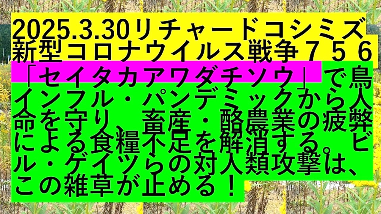<span style="color: #ff0000;"><strong> </strong></span><span style="color: #cc0000;"><strong>◐【 テーマ : 新型コロナウイルス戦争⦅ 756 ⦆】</strong></span><br><br> <span style="color: #ff0000;"><strong>「『 セイタカアワダチソウ 』で『 鳥インフルエンザ・パンデミック 』から『 人命 』を『 守り 』、『 畜産・酪農業 』の『 疲弊 』による<br> 『 食糧不足 』を『 解消 』する。『 ビル・ゲイツ 』らの『 対人類攻撃 』は、この『 雑草 』が『 止める 』! 」</strong></span><br><br> <span style="color: #38761d;"><strong>◐『 リチャード・コシミズ・チャンネル⦅ ニコニコ チャンネル ⦆』</strong></span><br> <span style="color: #0000ff;"><strong><a href="https://ch.nicovideo.jp/richardkoshimizu" target="_blank" rel="noopener nofollow">https://ch.nicovideo.jp/richardkoshimizu</a></strong></span><br><br> <span style="color: #38761d;"><strong>◐『 リチャード・コシミズ「 ニコニコ生放送⦅ LIVE ⦆」』</strong></span><br> <span style="color: #0000ff;"><strong><a href="https://www.nicovideo.jp/user/120930363/live_programs" target="_blank" rel="noopener nofollow">https://www.nicovideo.jp/user/120930363/live_programs</a></strong></span><br><br> <span style="color: #38761d;"><strong>◐『 リチャード・コシミズ「 Rumble 」公式「 動画ギャラリー 」』</strong></span><br> <span style="color: #0000ff;"><strong><a href="https://rumble.com/user/richardkoshimizu" target="_blank" rel="noopener nofollow">https://rumble.com/user/richardkoshimizu</a></strong></span><br> <span style="color: #0000ff;"><strong><a href="https://rumble.com/user/RKVideoGallery" target="_blank" rel="noopener nofollow">https://rumble.com/user/RKVideoGallery</a></strong></span><br><br>