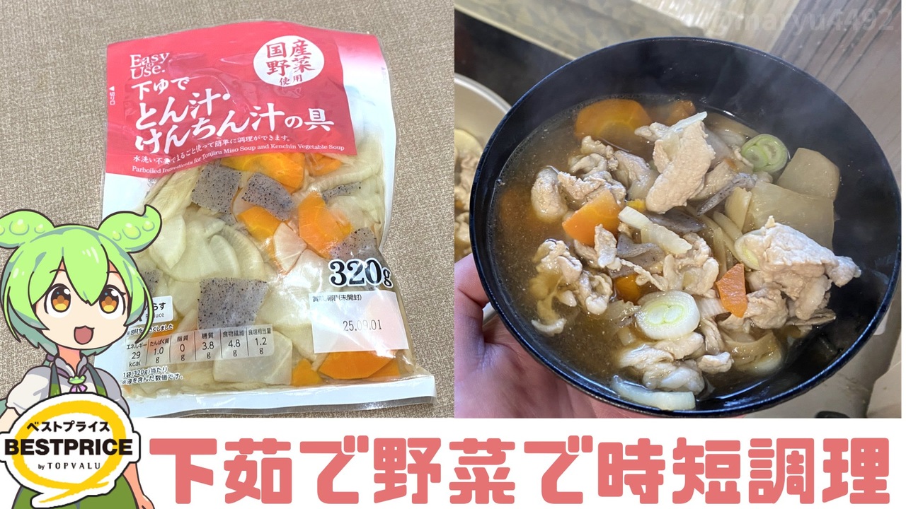 トップバリュの、国産野菜を使用した下茹で済みの野菜を使い <br>豚汁を作っていきます。<br><br><br>【参考】 <br>イージートゥユース 下ゆでとん汁・けんちん汁の具(トップバリュ) <br><a href="https://www.topvalu.net/items/detail/4549414655933/" target="_blank" rel="noopener nofollow">https://www.topvalu.net/items/detail/4549414655933/</a> <br>かつお風味香る白だし(トップバリュ)<br> <a href="https://www.topvalu.net/items/detail/4549741198295/" target="_blank" rel="noopener nofollow">https://www.topvalu.net/items/detail/4549741198295/</a><br> 和風だし(トップバリュ) <br><a href="https://www.topvalu.net/items/detail/4549414622485/" target="_blank" rel="noopener nofollow">https://www.topvalu.net/items/detail/4549414622485/</a> <br>料亭赤だしカップ(サンジルシ) <br><a href="https://www.san-j.co.jp/product/1198" target="_blank" rel="noopener nofollow">https://www.san-j.co.jp/product/1198</a> <br>株式会社長山フーズファクトリー <br><a href="https://nagayamaff.co.jp/" target="_blank" rel="noopener nofollow">https://nagayamaff.co.jp/</a><br><br>【使用した素材】(※敬称略) <br>(合成音声)VOICEVOX/ずんだもん/四国めたん/ <br><a href="https://voicevox.hiroshiba.jp/" target="_blank" rel="noopener nofollow">https://voicevox.hiroshiba.jp/</a> <br>(立ち絵)坂本アヒル<br> <a href="https://seiga.nicovideo.jp/seiga/im10788496?track" target="_blank" rel="noopener nofollow">https://seiga.nicovideo.jp/seiga/im10788496?track</a> <br>(楽曲)甘茶の音楽工房/「楽しい麦畑」「フルーツパフェ」「お城の舞踏会」 <br><a href="https://amachamusic.chagasi.com/" target="_blank" rel="noopener nofollow">https://amachamusic.chagasi.com/</a>