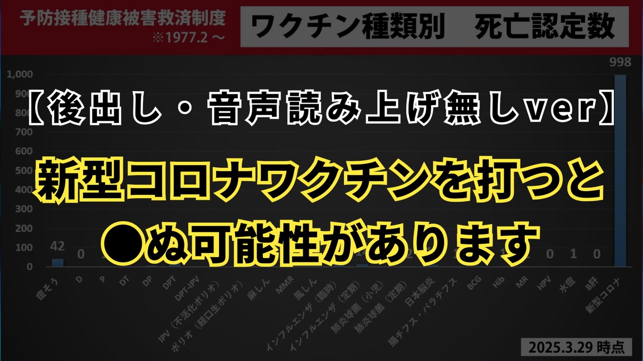 「新型コロナワクチンを打つと、●ぬ可能性があります(直球)」<br><br>一つも間違った事言ってませんが、規制する理由がありますか🤢? <a href="https://t.co/wwjTtnh97u" target="_blank" rel="noopener nofollow">https://t.co/wwjTtnh97u</a><br> <br><br><br>「新型コロナワクチンを含む予防接種の安全性に疑問を抱いたことはありませんか? <br>この動画では、1977年から2025年3月までの予防接種健康被害救済制度に基づく死亡認定データを徹底分析。 <br>ポリオ、日本脳炎、インフルエンザなど、さまざまなワクチンの死亡認定数をヒストグラムで視覚化し、特に注目すべきポイントを明らかにします。 <br>どのワクチンがどれだけのリスクを伴うのか、データが語る事実に迫る衝撃の内容。 <br>あなたが知っておくべき情報がここに。 <br>見逃せない事実を今すぐチェック!」<br><br><br>◆ 今回の台本<br><a href="https://keiichiro8140.hatenablog.com/entry/20250402003" target="_blank" rel="noopener nofollow">https://keiichiro8140.hatenablog.com/entry/20250402003</a><br><br><br>ワクチン安全性<br>予防接種健康被害救済制度<br>新型コロナワクチン<br>死亡認定数<br>ワクチン<br>分析<br>ニュース<br>ワクチン比較<br>データで見る真実<br>健康と安全<br>SNS規制<br><br><br>使用楽曲<br>ファイルX<br><a href="https://bgmer.net/music/143" target="_blank" rel="noopener nofollow">https://bgmer.net/music/143</a><br>