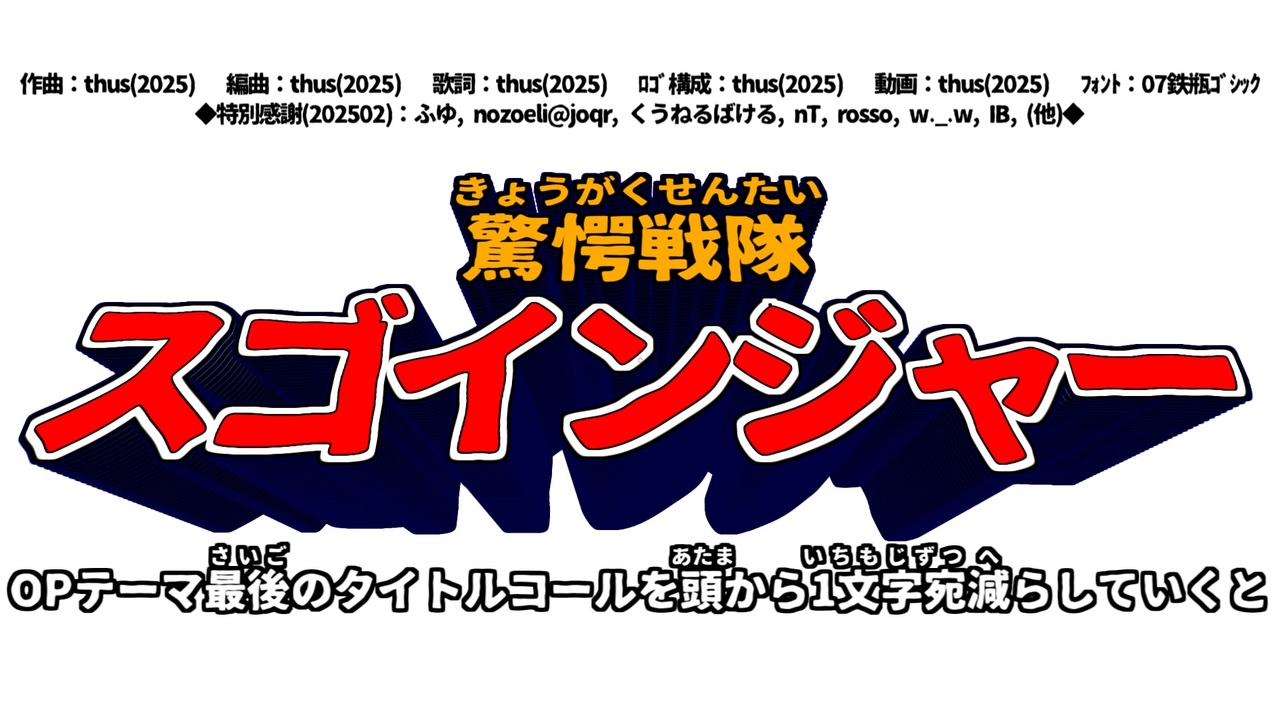◆「言葉遊び楽曲投稿祭」出展作品です(詳細:<a href="https://twipla.jp/events/637102" target="_blank" rel="noopener nofollow">https://twipla.jp/events/637102</a> )<br>・開催日時:2025/04/(04 19時 - 06 18時)<br>・主催:背面8回宙返り(<a href="https://www.nicovideo.jp/user/128494451" target="_blank" rel="noopener">user/128494451</a> )<br>―<br><br> Wow! (カラオケ動画:<a href="https://www.nicovideo.jp/watch/sm44841890" class="watch">sm44841890</a> )<br> この馬鹿みたいに長ったらしいタイトル。実はこれ私が子どものころ実際に遊んでいた1人言葉遊びです。真逆公にする時が来るとは…というか私自身もすっかり忘れてたんですけどね…。<br> 今迚も時間なんか全然なくて…ずっと現実の事ばっかりやってそろそろ1か月です。そしてそれはもう暫く続きそうなのですが、その限られた時間で言葉遊びの曲かぁ…と思いを巡らせたときに、そういえば戦隊もののオープニング曲の最後のタイトルコールを1文字宛減らしていって歌う遊びしてたなぁと思い出して、この曲が出来たわけです。スゴインジャー? そんな戦隊ものはありません。Wow!<br> 私が一番好きなのは『特命戦隊ゴーバスターズ』です。無駄を極限まで削ぎ落したスタイリッシュな変身や、戦隊もののお約束を破った戦略的な戦闘展開が、迚も好きです。特に好きな話は第45話、お見合い中の青にばれないように戦闘をする赤と黄、デカい音がして青が思わず見に行って「今でかい音しなかった?」という問いに赤が「あそれ俺のくしゃみです<span style="font-size: 24px;"><strong>ハクショォオイ</strong></span>」みたいなことを答えるのが迚も好きです。<br> 今は確か、ナンバーワン戦隊でしたね。戦隊もの好きの同級生が居たので、今も見てるんだろうなぁと想像しながら。<br><br>2025/04/07 19:39:2,525再生<br>2025/04/11 18:29:1万再生<br /><br><br><br>====================<br>| 2026/01/04 21:00「インスペクタの自死未遂」:<a href="https://www.nicovideo.jp/watch/sm45800854" class="watch">sm45800854</a><br>| 投稿曲マイリスト:<a href="https://www.nicovideo.jp/mylist/57867175" target="_blank" rel="noopener">mylist/57867175</a><br>|――――――――――――――――――<br>| pixivFANBOX:<a href="https://thus.fanbox.cc/" target="_blank" rel="noopener nofollow">https://thus.fanbox.cc/</a><br>| アルバム等配信中:<a href="https://thus-library.blogspot.com/search/label/discography" target="_blank" rel="noopener nofollow">https://thus-library.blogspot.com/search/label/discography</a><br>| つなぐ(依頼・リクエスト):<a href="https://tsunagu.cloud/users/thus" target="_blank" rel="noopener nofollow">https://tsunagu.cloud/users/thus</a><br>|――――――――――――――――――<br>| YouTube:<a href="https://youtube.com/@thus" target="_blank" rel="noopener nofollow">https://youtube.com/@thus</a><br>| X:<a href="https://x.com/thus_submission" target="_blank" rel="noopener nofollow">https://x.com/thus_submission</a><br>| 他全リンク:<a href="https://lit.link/thus" target="_blank" rel="noopener nofollow">https://lit.link/thus</a><br>|――――――――――――――――――<br>| オフボーカル等:<a href="https://piapro.jp/thus_999discommunication" target="_blank" rel="noopener nofollow">https://piapro.jp/thus_999discommunication</a><br>| 楽曲/動画の二次利用に関して:<a href="https://bit.ly/3JRQQiZ" target="_blank" rel="noopener nofollow">https://bit.ly/3JRQQiZ</a><br><span style="color: #262626;">| </span><span style="color: #262626;"><strong>歌詞図書館(ふりがな有るよ!):</strong></span><a href="https://thus-library.blogspot.com/" target="_blank" rel="noopener nofollow">https://thus-library.blogspot.com/</a><br>====================