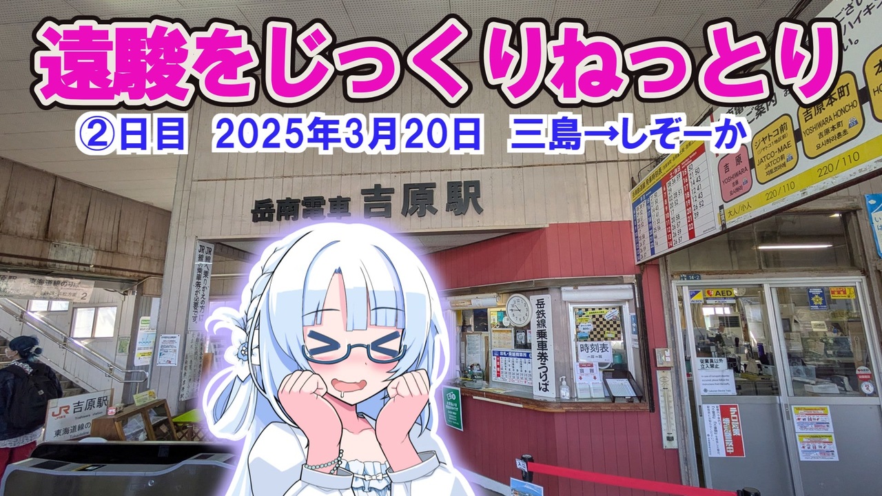 本業が水・日・祝祭日やけん、3月19日(水)と20日(木)の春分の日でしぞーか巡ってきました2日目。<br>なあにぃぃい?1日目を見とらんとや?こっち見てくと幸せになりますぞw→<a href="https://www.nicovideo.jp/watch/sm44810956" class="watch">sm44810956</a><br><span style="color: #ff9900; font-size: 18px;"><strong>ニコ動で拝見した動画を今回のルート選定の参考といたしました。三島を辿った方の旅路、わしの趣味どっぷり全く別視点で追走するものまた一興、、、と感じて頂ければ幸いです。</strong></span><br><span style="color: #4a86e8; font-size: 18px;"><strong>追記 だわ(終わった人)様(<a href="https://www.nicovideo.jp/user/440220" target="_blank" rel="noopener">user/440220</a>)、多額のギフトに広告ポイント、ありがとうございます!復職から慣れるまで大変かと思いますが、上手く行きますようご祈念申し上げます。</strong></span><br><br>参考文献!<br>どね様<a href="https://www.nicovideo.jp/user/322237" target="_blank" rel="noopener">user/322237</a>作、ペダルと脚で #20 - 水の街・三島【日帰り旅行動画祭】<a href="https://www.nicovideo.jp/watch/sm44195584" class="watch">sm44195584</a><br>源兵衛川など三島市の水系に関する分析力がSUGOKA!<br>雪さんのサワガニ日記様<a href="https://www.nicovideo.jp/user/4244778" target="_blank" rel="noopener">user/4244778</a>作、三島の町をお散歩しましょう【第2回ナイスビュー投稿祭】<a href="https://www.nicovideo.jp/watch/sm44583134" class="watch">sm44583134</a><br>ほんわか雰囲気でゆるゆる🦀雪さんと戯れるが良いぞ!三島に関しては多数動画を上げてらっしゃいますので、他の動画も是非ご覧あれ。<br><br>ゆっくりムービーメーカー4 <a href="https://commons.nicovideo.jp/works/nc236011" target="_blank" rel="noopener">nc236011</a><br>WhiteCul © 2022 WhiteCUL, ZAN-SHIN KK. All Rights Reserved.<br>WhiteCul 二次創作ガイドライン<a href="https://commons.nicovideo.jp/works/nc312647" target="_blank" rel="noopener">nc312647</a><br>WhiteCul立ち絵 moiky様<a href="https://www.nicovideo.jp/user/14152657" target="_blank" rel="noopener">user/14152657</a> <a href="https://seiga.nicovideo.jp/seiga/im11374964" target="_blank" rel="noopener">im11374964</a><br>voicepeak フリモメン・フリモメン立ち絵<br><br>BGM 騒音のない世界様<a href="https://www.nicovideo.jp/user/93555972" target="_blank" rel="noopener">user/93555972</a> <br>東海道をゆく<a href="https://www.nicovideo.jp/watch/sm36177963" class="watch">sm36177963</a>・スペースシップ<a href="https://www.nicovideo.jp/watch/sm44031025" class="watch">sm44031025</a>・さんさんドライブ<a href="https://www.nicovideo.jp/watch/sm40812680" class="watch">sm40812680</a><br>まんぼう二等兵様<a href="https://www.nicovideo.jp/user/49478066" target="_blank" rel="noopener">user/49478066</a> ウミネコロード<a href="https://www.nicovideo.jp/watch/sm41280668" class="watch">sm41280668</a><br><br>シーンチェンジ<a href="https://commons.nicovideo.jp/works/nc224466" target="_blank" rel="noopener">nc224466</a> シャル様<a href="https://www.nicovideo.jp/user/97437895" target="_blank" rel="noopener">user/97437895</a><br><br><a target="_blank" href="https://qa.nicovideo.jp/faq/show/19424?site_domain=default" style="font-size: 13px;color: #657586; text-decoration: underline; line-height: 1.4">この動画は投稿者によって修正されました</a>