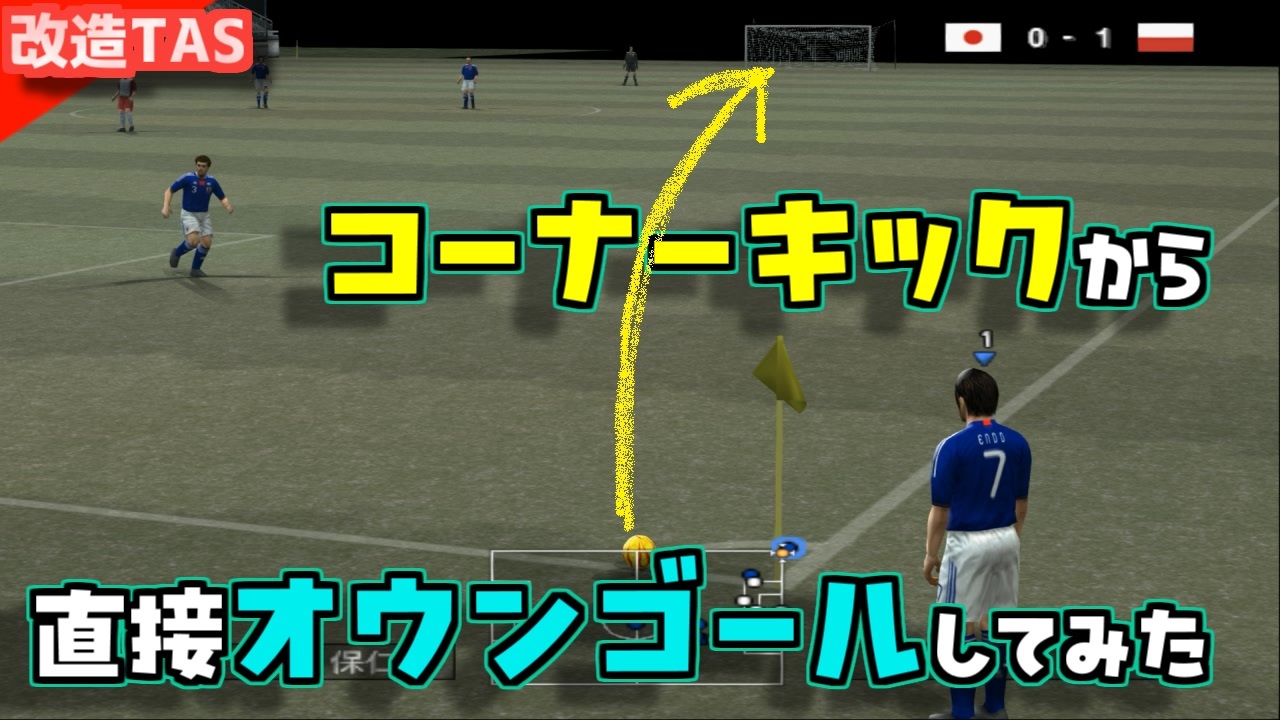 今日の改造ウイイレはリクエストに応えてみたシリーズです<br>と言う事で、コメントにありました<br>「コーナーキックを直接自陣ゴールに決めて欲しい」<br>と言う良く分からないリクエストに挑戦してみました。<br><br>当然改造プレイ&TAS(主にドリブル部分)になります。<br>なお、コーナーキックにおける方向の制限解除<br>シュートパワーアップの改造がされています。<br>(楢崎選手の挑戦は来週以降で許して)<br><br><br>・その他のおすすめ動画<br>【ウイイレ】シュート力255の弾丸シュート10選【TAS】→<a href="https://www.nicovideo.jp/watch/sm41652259" class="watch">sm41652259</a><br>【TAS】ウイイレでシュート力を255にするとどうなるのか→<a href="https://www.nicovideo.jp/watch/sm41591324" class="watch">sm41591324</a><br>プロスピ 肩力を最強(255)にしてみた【レーザービーム】→<a href="https://www.nicovideo.jp/watch/sm42115986" class="watch">sm42115986</a><br>ウイイレ カーブ力を最強にしたらどうなるのか?検証【TAS】→<a href="https://www.nicovideo.jp/watch/sm41880115" class="watch">sm41880115</a><br>【ウイイレ】超絶ドリブルテクニック11選【TAS】→<a href="https://www.nicovideo.jp/watch/sm41746191" class="watch">sm41746191</a><br>プロスピ 999キロを越える最強のピッチャーで試合【プロ野球スピリッツ】→<a href="https://www.nicovideo.jp/watch/sm41989119" class="watch">sm41989119</a><br>プロスピ 999キロの投球を打者視点で体感&デッドボール【プロ野球スピリッツ】→<a href="https://www.nicovideo.jp/watch/sm42019698" class="watch">sm42019698</a><br>プロスピ バントでホームランが出るのは何キロのピッチャーが必要?【プロ野球スピリッツ】→<a href="https://www.nicovideo.jp/watch/sm42051815" class="watch">sm42051815</a><br><br />動画に「いいね!」「マイリスト登録」よろしくお願いします。<br><br>・おすすめ<br>[TAS]Grand Theft Auto 3 Part1→<a href="https://www.nicovideo.jp/watch/sm14718961" class="watch">sm14718961</a><br>[TAS]MaxPayne デッドターゲット Part1→<a href="https://www.nicovideo.jp/watch/sm15093299" class="watch">sm15093299</a><br>[TAS]michigan Part1→<a href="https://www.nicovideo.jp/watch/sm18393230" class="watch">sm18393230</a><br><br>サポート頂けると励みになります<br>魔界塔士のサポーターになる→<a href="https://creator-support.nicovideo.jp/registration/15153622" target="_blank" rel="noopener nofollow">https://creator-support.nicovideo.jp/registration/15153622</a><br><br>TAS動画まとめ→<a href="https://koeiprogenitor.com/tas/matome/" target="_blank" rel="noopener nofollow">https://koeiprogenitor.com/tas/matome/</a><br>つべ→<a href="https://www.youtube.com/user/koeiprogenitor1/" target="_blank" rel="noopener nofollow">https://www.youtube.com/user/koeiprogenitor1/</a><br>インスタ→<a href="https://www.instagram.com/makaitoshi" target="_blank" rel="noopener nofollow">https://www.instagram.com/makaitoshi</a><br><br>本編→シリーズ一覧見てね<br>