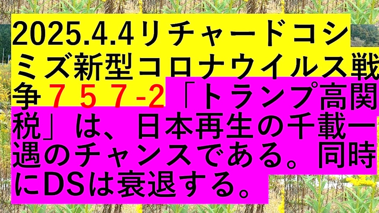 <span style="color: #ff0000;"><strong> </strong></span><span style="color: #cc0000;"><strong>◐【 テーマ : 新型コロナウイルス戦争⦅ 757- ② ⦆】</strong></span><br><br> <span style="color: #ff0000;"><strong>「『 ドナルド・トランプ高関税 』は、『 日本再生 』の『 千載一遇 』の『 チャンス 』である。『 同時 』に、『 DEEP STATE 』は『 衰退 』する 」</strong></span><br><br> <span style="color: #38761d;"><strong>◐『 リチャード・コシミズ・チャンネル⦅ ニコニコ チャンネル ⦆』</strong></span><br> <span style="color: #0000ff;"><strong><a href="https://ch.nicovideo.jp/richardkoshimizu" target="_blank" rel="noopener nofollow">https://ch.nicovideo.jp/richardkoshimizu</a></strong></span><br><br> <span style="color: #38761d;"><strong>◐『 リチャード・コシミズ「 ニコニコ生放送⦅ LIVE ⦆」』</strong></span><br> <span style="color: #0000ff;"><strong><a href="https://www.nicovideo.jp/user/120930363/live_programs" target="_blank" rel="noopener nofollow">https://www.nicovideo.jp/user/120930363/live_programs</a></strong></span><br><br> <span style="color: #38761d;"><strong>◐『 リチャード・コシミズ「 Rumble 」公式「 動画ギャラリー 」』</strong></span><br> <span style="color: #0000ff;"><strong><a href="https://rumble.com/user/richardkoshimizu" target="_blank" rel="noopener nofollow">https://rumble.com/user/richardkoshimizu</a></strong></span><br> <span style="color: #0000ff;"><strong><a href="https://rumble.com/user/RKVideoGallery" target="_blank" rel="noopener nofollow">https://rumble.com/user/RKVideoGallery</a></strong></span><br><br>