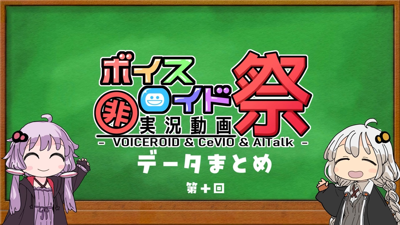 この作品は第十回VOICEROID非実況祭(ひじき祭)のデータまとめになります。<br><br>今回も『ひじきさいどうがみるかかり』さんのご協力のもと、まとめることができました!<br>作品内のデータを見ながらお話のタネになったらいいなと思います。<br><br>データがいっぱい=パーティみたいってことでVIVID VOICE FESTIVALにオジャマしてます♪<br><br><br>【タイムテーブル】<br>動画の再生時間 <a href="#" class="seekTime" data-seekTime="1:24" onclick="seekNicoPlayer('#1:24'); return false;">#1:24</a><br>投稿日 <a href="#" class="seekTime" data-seekTime="2:30" onclick="seekNicoPlayer('#2:30'); return false;">#2:30</a><br>投稿時間 <a href="#" class="seekTime" data-seekTime="3:20" onclick="seekNicoPlayer('#3:20'); return false;">#3:20</a><br>各ジャンルの投稿数 <a href="#" class="seekTime" data-seekTime="4:16" onclick="seekNicoPlayer('#4:16'); return false;">#4:16</a><br>SNSの利用状況 <a href="#" class="seekTime" data-seekTime="5:27" onclick="seekNicoPlayer('#5:27'); return false;">#5:27</a><br>出演キャラクター <a href="#" class="seekTime" data-seekTime="6:26" onclick="seekNicoPlayer('#6:26'); return false;">#6:26</a><br>サポーター数 <a href="#" class="seekTime" data-seekTime="10:24" onclick="seekNicoPlayer('#10:24'); return false;">#10:24</a><br>第十回ひじき祭企画レポート <a href="#" class="seekTime" data-seekTime="13:03" onclick="seekNicoPlayer('#13:03'); return false;">#13:03</a><br><br>第九回ひじき祭データまとめ:<a href="https://www.nicovideo.jp/watch/sm43549041" class="watch">sm43549041</a><br><br>【集計データ】(2025/4/30まで公開)<br>公開は終了しました。ありがとうございました!(2025/5/1更新)<br><br>【本作の声の出演】(順不同)<br><br>VOICEROID2<br>・結月ゆかり(&exVOICE)<br><br>A.I.VOICE<br>・紲星あかり(&exVOICE)<br><br>VOICEPEAK<br>・小春六花(&exVOICE)<br>・フリモメン<br><br>CeVIO AI<br>・弦巻マキ(CeVIO AI 英語版)<br><br>【ひじき祭運営】<br>twitter(X):<a href="https://twitter.com/nonlivevideo" target="_blank" rel="noopener nofollow">https://twitter.com/nonlivevideo</a><br>はてなブログ:<a href="https://hiziki.hatenablog.jp/" target="_blank" rel="noopener nofollow">https://hiziki.hatenablog.jp/</a><br><br>【マイリスト】<br>第十回ひじき祭作品マイリスト①:<a href="https://www.nicovideo.jp/mylist/77223653" target="_blank" rel="noopener">mylist/77223653</a><br> ②:<a href="https://www.nicovideo.jp/mylist/77223655" target="_blank" rel="noopener">mylist/77223655</a><br> CM:<a href="https://www.nicovideo.jp/mylist/77204364" target="_blank" rel="noopener">mylist/77204364</a><br> 後夜祭:<a href="https://www.nicovideo.jp/mylist/77223661" target="_blank" rel="noopener">mylist/77223661</a><br><br>【使用素材】<br>ニコニコモンズ<br>効果音ラボ<br>フキダシデザイン<br>5000兆円欲しいジェネレーター<br>えだまめ88(BGM)<br><a href="https://x.com/edamaaaaame88" target="_blank" rel="noopener nofollow">https://x.com/edamaaaaame88</a><br><br>【素材関連権利表記】<br>名無節モドキ<br>猫乃ゆみ。<br>ju-nya<br>