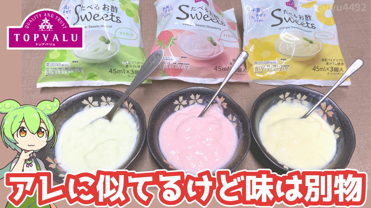お酢がもっと楽しくなる!フルーチェっぽいヤツです。<br>リンゴ酢と国産果汁を材料にしていて、空き容器で牛乳を計測することができます。<br><br><br>【参考】<br>Sweets(たべるお酢)パイン ※本体価格278円/45ml×3個(トップバリュ)<br><a href="https://www.topvalu.net/items/detail/4549414668346/" target="_blank" rel="noopener nofollow">https://www.topvalu.net/items/detail/4549414668346/</a><br>Sweets(たべるお酢)マスカット ※45ml×3個(トップバリュ)<br><a href="https://www.topvalu.net/items/detail/4549414668353/" target="_blank" rel="noopener nofollow">https://www.topvalu.net/items/detail/4549414668353/</a><br>Sweets(たべるお酢)ストロベリー ※本体価格278円/45ml×3個(トップバリュ)<br>株式会社やまと蜂蜜<br><a href="https://www.yamato-honey.co.jp/" target="_blank" rel="noopener nofollow">https://www.yamato-honey.co.jp/</a><br><a href="https://www.topvalu.net/items/detail/4549414668339/" target="_blank" rel="noopener nofollow">https://www.topvalu.net/items/detail/4549414668339/</a><br>“朝・昼・夜”を彩る新感覚のお酢ライフ <br>お酢をおいしく手軽に楽しむ新商品を発売 2025.03.06(PR TIMES)<br><a href="https://prtimes.jp/main/html/rd/p/000004935.000007505.html" target="_blank" rel="noopener nofollow">https://prtimes.jp/main/html/rd/p/000004935.000007505.html</a><br>フルーチェはどうして固まるのですか。(ハウス)<br><a href="https://housefoods.jp/inquiry/qa/answer_06_01.html" target="_blank" rel="noopener nofollow">https://housefoods.jp/inquiry/qa/answer_06_01.html</a><br>フルーチェは豆乳でも固まりますか。(ハウス)<br><a href="https://housefoods.jp/inquiry/qa/answer_06_02.html" target="_blank" rel="noopener nofollow">https://housefoods.jp/inquiry/qa/answer_06_02.html</a><br><br>【使用した素材】(※敬称略) <br>(合成音声)VOICEVOX/ずんだもん/四国めたん/<br><a href="https://voicevox.hiroshiba.jp/" target="_blank" rel="noopener nofollow">https://voicevox.hiroshiba.jp/</a> <br>(立ち絵)坂本アヒル<br> <a href="https://seiga.nicovideo.jp/seiga/im10788496?track" target="_blank" rel="noopener nofollow">https://seiga.nicovideo.jp/seiga/im10788496?track</a><br>(楽曲)甘茶の音楽工房/「楽しい麦畑」「フルーツパフェ」「お城の舞踏会」<br><a href="https://amachamusic.chagasi.com/" target="_blank" rel="noopener nofollow">https://amachamusic.chagasi.com/</a>