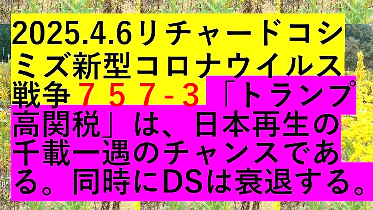 <span style="color: #ff0000;"><strong> </strong></span><span style="color: #cc0000;"><strong>◐【 テーマ : 新型コロナウイルス戦争⦅ 757- ③ ⦆】</strong></span><br><br> <span style="color: #ff0000;"><strong>「『 ドナルド・トランプ高関税 』は、『 日本再生 』の『 千載一遇 』の『 チャンス 』である。『 同時 』に、『 DEEP STATE 』は『 衰退 』する 」</strong></span><br><br> <span style="color: #38761d;"><strong>◐『 リチャード・コシミズ・チャンネル⦅ ニコニコ チャンネル ⦆』</strong></span><br> <span style="color: #0000ff;"><strong><a href="https://ch.nicovideo.jp/richardkoshimizu" target="_blank" rel="noopener nofollow">https://ch.nicovideo.jp/richardkoshimizu</a></strong></span><br><br> <span style="color: #38761d;"><strong>◐『 リチャード・コシミズ「 ニコニコ生放送⦅ LIVE ⦆」』</strong></span><br> <span style="color: #0000ff;"><strong><a href="https://www.nicovideo.jp/user/120930363/live_programs" target="_blank" rel="noopener nofollow">https://www.nicovideo.jp/user/120930363/live_programs</a></strong></span><br><br> <span style="color: #38761d;"><strong>◐『 リチャード・コシミズ「 Rumble 」公式「 動画ギャラリー 」』</strong></span><br> <span style="color: #0000ff;"><strong><a href="https://rumble.com/user/richardkoshimizu" target="_blank" rel="noopener nofollow">https://rumble.com/user/richardkoshimizu</a></strong></span><br> <span style="color: #0000ff;"><strong><a href="https://rumble.com/user/RKVideoGallery" target="_blank" rel="noopener nofollow">https://rumble.com/user/RKVideoGallery</a></strong></span><br><br>