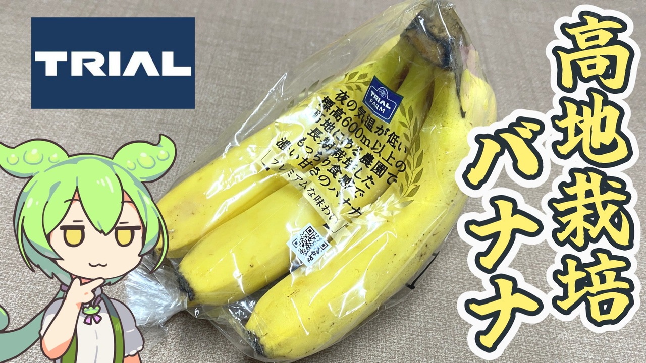 バナナは高地で栽培すると甘くてもちもちした食感になるそうです。<br>------------------------------------------------------------------------------------------------------------------------<br>(訂正)<br>上部字幕、トライアル:通常商品ですが6本ではなく、正しくは4本です。<br>値段や1本あたり39.8円はあっています。<br>------------------------------------------------------------------------------------------------------------------------<br><br>【関連動画】<br>トライアルの「簡単に手で皮がむけるおいしいオレンジ(税込み499円/6個)2025.03.14<br><a href="https://www.nicovideo.jp/watch/sm44759358" target="_blank" rel="noopener nofollow">https://www.nicovideo.jp/watch/sm44759358</a><br>トップバリュの「バナナ」2023.06.24<br><a href="https://www.nicovideo.jp/watch/sm42385594" target="_blank" rel="noopener nofollow">https://www.nicovideo.jp/watch/sm42385594</a><br><br>【参考】<br>TRIAL FARMバナナが安くておいしい理由 2023.01.20(トライアルマガジン)<br><a href="https://www.trial-net.co.jp/mag/detail/6703/" target="_blank" rel="noopener nofollow">https://www.trial-net.co.jp/mag/detail/6703/</a><br>高地栽培で甘さが濃くもっちりとした食感に、高品質バナナ新発売!<br>2025.01.09(トライアルマガジン)<br><a href="https://www.trial-net.co.jp/mag/detail/11789/" target="_blank" rel="noopener nofollow">https://www.trial-net.co.jp/mag/detail/11789/</a><br><br>【使用した素材】(※敬称略) <br>(合成音声)VOICEVOX/ずんだもん/四国めたん/<br><a href="https://voicevox.hiroshiba.jp/" target="_blank" rel="noopener nofollow">https://voicevox.hiroshiba.jp/</a> <br>(立ち絵)坂本アヒル<br> <a href="https://seiga.nicovideo.jp/seiga/im10788496?track" target="_blank" rel="noopener nofollow">https://seiga.nicovideo.jp/seiga/im10788496?track</a><br>(楽曲)甘茶の音楽工房/「楽しい麦畑」「フルーツパフェ」「お城の舞踏会」<br><a href="https://amachamusic.chagasi.com/" target="_blank" rel="noopener nofollow">https://amachamusic.chagasi.com/</a>