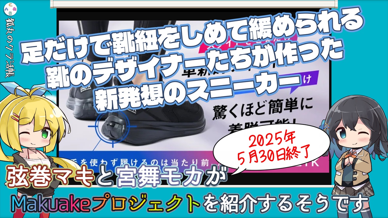 ■ 紹介プロジェクト<br>「革新的着脱スニーカー!踵ローラーで簡単フィット・ボタンで驚くほど楽に脱げる靴!」<br><a href="https://www.makuake.com/project/eazyk/" target="_blank" rel="noopener nofollow">https://www.makuake.com/project/eazyk/</a><br><br>■ この動画について<br>こんにちは。#Makuakeアンバサダー の狐丸です。<br><br>今回は、5月30日までプロジェクト実行中のスニーカープロジェクトの紹介です。<br>1秒で履けるという楽なスニーカーは最近よく見かけますが、<br>こちら手を使ったりかがんだりしなくても履いて、脱げるスニーカー。<br><br>ダイヤルで靴紐を締められるものは以前からありましたが、<br>こちらはそのダイヤルの装置が踵にあるという点でとてもユニークです。<br><br>詳細は動画の方を見てください。<br><br>■ チャプター<br><a href="#" class="seekTime" data-seekTime="00:00" onclick="seekNicoPlayer('#00:00'); return false;">#00:00</a> オープニング<br><a href="#" class="seekTime" data-seekTime="00:41" onclick="seekNicoPlayer('#00:41'); return false;">#00:41</a> プロジェクト紹介<br><a href="#" class="seekTime" data-seekTime="03:04" onclick="seekNicoPlayer('#03:04'); return false;">#03:04</a> 実行者紹介<br><a href="#" class="seekTime" data-seekTime="03:46" onclick="seekNicoPlayer('#03:46'); return false;">#03:46</a> スケジュール・プラン情報<br><a href="#" class="seekTime" data-seekTime="04:28" onclick="seekNicoPlayer('#04:28'); return false;">#04:28</a> エンディング<br><br>■ CAST<br>弦巻マキ<br> (CV) VOICEPEAK / (イラスト) りょうご<br>宮舞モカ<br> (CV) VOICEPEAK / (イラスト) りょうご<br>フリモメン<br> (CV) VOICEPEAK / (イラスト) maruan<br><br>■ BGM<br>「君とおでかけ」by Hareno<br> → <a href="https://www.nicovideo.jp/watch/sm44264123" class="watch">sm44264123</a><br><br>■ 注意事項<br>(1) 紹介したプロジェクトの情報は動画作成時に確認しながら作成していますが、最新情報ではない場合があります<br>(2) 動画内で使用しているプロジェクトの画像等は #Makuakeアンバサダー 活動としてMakuakeより許可をいただいて使用しています<br><br />YoutubeやXなどもよろしくお願いします。<br><br>Youtube: <br><a href="http://www.youtube.com/@kurakatsucho" target="_blank" rel="noopener nofollow">http://www.youtube.com/@kurakatsucho</a><br><br>X:<br><a href="https://x.com/fenefox" target="_blank" rel="noopener nofollow">https://x.com/fenefox</a><br><br>Threads:<br><a href="https://www.threads.net/@fenefox_th" target="_blank" rel="noopener nofollow">https://www.threads.net/@fenefox_th</a><br><br>mixi2:<br>@fenefox