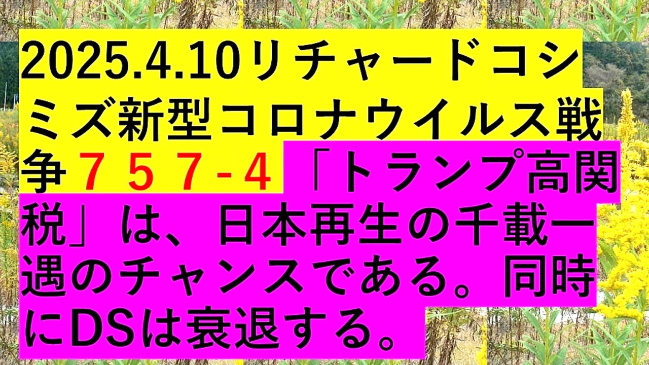 <span style="color: #ff0000;"><strong> </strong></span><span style="color: #cc0000;"><strong>◐【 テーマ : 新型コロナウイルス戦争⦅ 757- ④ ⦆】</strong></span><br><br> <span style="color: #ff0000;"><strong>「『 ドナルド・トランプ高関税 』は、『 日本再生 』の『 千載一遇 』の『 チャンス 』である。『 同時 』に、『 DEEP STATE 』は『 衰退 』する 」</strong></span><br><br> <span style="color: #38761d;"><strong>◐『 リチャード・コシミズ・チャンネル⦅ ニコニコ チャンネル ⦆』</strong></span><br> <span style="color: #0000ff;"><strong><a href="https://ch.nicovideo.jp/richardkoshimizu" target="_blank" rel="noopener nofollow">https://ch.nicovideo.jp/richardkoshimizu</a></strong></span><br><br> <span style="color: #38761d;"><strong>◐『 リチャード・コシミズ「 ニコニコ生放送⦅ LIVE ⦆」』</strong></span><br> <span style="color: #0000ff;"><strong><a href="https://www.nicovideo.jp/user/120930363/live_programs" target="_blank" rel="noopener nofollow">https://www.nicovideo.jp/user/120930363/live_programs</a></strong></span><br><br> <span style="color: #38761d;"><strong>◐『 リチャード・コシミズ「 Rumble 」公式「 動画ギャラリー 」』</strong></span><br> <span style="color: #0000ff;"><strong><a href="https://rumble.com/user/richardkoshimizu" target="_blank" rel="noopener nofollow">https://rumble.com/user/richardkoshimizu</a></strong></span><br> <span style="color: #0000ff;"><strong><a href="https://rumble.com/user/RKVideoGallery" target="_blank" rel="noopener nofollow">https://rumble.com/user/RKVideoGallery</a></strong></span><br><br>