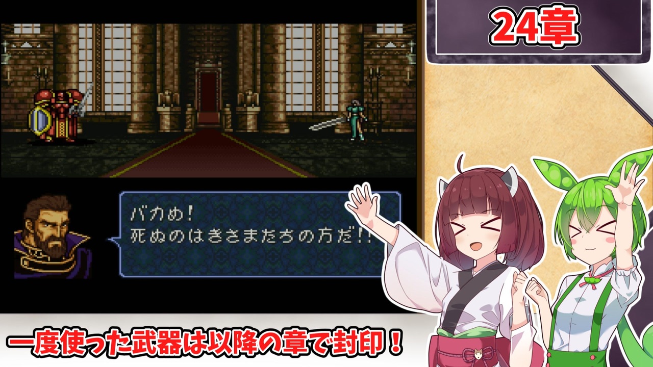 <span style="color: #85200c; font-size: 24px;"><strong><i>今日は大盤振る舞い</i></strong></span><br><br><br><span style="font-size: 16px;"><strong>1:一度使用した武器種は、以降の章で使用する事を禁止する。<br>2:武器の使用の定義は『その武器を装備した状態で敵との戦闘が発生したタイミング』<br>または『その武器を使って敵に「捕える」コマンドを実行したタイミング』<br>杖の場合は『対象に対して使用した時点(命中の可否は問わない)』とする。 </strong></span><br><span style="color: #ff0000; font-size: 16px;"><strong>※同盟軍、演出による戦闘イベントでは使用した判定にはならないこととする。</strong></span><span style="font-size: 16px;"><strong> <br>3:仲間を47人生存させ、【外伝】を含む全ての章を攻略し、総合評価でB以上の状態でゲームをクリアする。</strong></span><br><br><br>本動画のシリーズリスト【<a href="https://www.nicovideo.jp/series/482976" target="_blank" rel="noopener">series/482976</a>】<br>『烈火』の同縛りプレイ【<a href="https://www.nicovideo.jp/series/406473" target="_blank" rel="noopener">series/406473</a>】<br>『封印』の同縛りプレイ【<a href="https://www.nicovideo.jp/series/316824" target="_blank" rel="noopener">series/316824</a>】<br>前:【<a href="https://www.nicovideo.jp/watch/sm44845385" class="watch">sm44845385</a>】次:【<a href="https://www.nicovideo.jp/watch/sm44891063" class="watch">sm44891063</a>】<br><br><strong>使用したソフト</strong><br>VOICEROID+東北きりたんEX<br>VOICEVOX:ずんだもん<br>VOICEPEA:ずんだもん<br><strong>お借りした素材</strong><br>ニコニコモンズの皆様(コンテンツツリー参照)<br><br><a target="_blank" href="https://qa.nicovideo.jp/faq/show/19424?site_domain=default" style="font-size: 13px;color: #657586; text-decoration: underline; line-height: 1.4">この動画は投稿者によって修正されました</a>