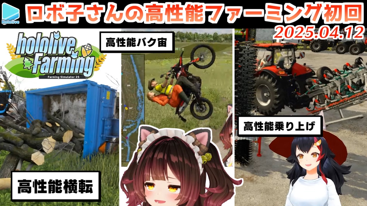 <a href="#" class="seekTime" data-seekTime="00:00" onclick="seekNicoPlayer('#00:00'); return false;">#00:00</a> ロボ子さんの高性能運転<br><a href="#" class="seekTime" data-seekTime="01:56" onclick="seekNicoPlayer('#01:56'); return false;">#01:56</a> 免許持ってるの?<br><a href="#" class="seekTime" data-seekTime="02:08" onclick="seekNicoPlayer('#02:08'); return false;">#02:08</a> 天然リオナ<br><a href="#" class="seekTime" data-seekTime="02:37" onclick="seekNicoPlayer('#02:37'); return false;">#02:37</a> ロボ子で大丈夫なのか?<br><a href="#" class="seekTime" data-seekTime="03:08" onclick="seekNicoPlayer('#03:08'); return false;">#03:08</a> 高性能クレーン<br><a href="#" class="seekTime" data-seekTime="04:12" onclick="seekNicoPlayer('#04:12'); return false;">#04:12</a> 高性能ナビ<br><a href="#" class="seekTime" data-seekTime="04:27" onclick="seekNicoPlayer('#04:27'); return false;">#04:27</a> 高性能バイク<br><a href="#" class="seekTime" data-seekTime="05:50" onclick="seekNicoPlayer('#05:50'); return false;">#05:50</a> 高性能横転<br><br>元動画様はこちら<br>【 #ホロライブファーマーズ】求人をみてやってきました、新人です【ホロライブ/ ロボ子さん】<br><a href="https://youtu.be/bNKJHe2j1BQ" target="_blank" rel="noopener nofollow">https://youtu.be/bNKJHe2j1BQ</a><br><br>【Farming Simulator 25】作付けの季節!農業するぞ~~!【大神ミオ視点】<br><a href="https://youtu.be/rQnmQ5DTWoQ" target="_blank" rel="noopener nofollow">https://youtu.be/rQnmQ5DTWoQ</a><br><br>Roboco Ch. - ロボ子 <a href="https://t.co/9Tw5lajPeC" target="_blank" rel="noopener nofollow">https://t.co/9Tw5lajPeC</a><br>フブキCh。白上フブキ <a href="https://t.co/R9TNhC7sPO" target="_blank" rel="noopener nofollow">https://t.co/R9TNhC7sPO</a><br>Mio Channel 大神ミオ <a href="https://t.co/srC9Gb4Mxi" target="_blank" rel="noopener nofollow">https://t.co/srC9Gb4Mxi</a><br>Riona Ch. 響咲リオナ - FLOW GLOW <a href="https://t.co/VMzllnZDvq" target="_blank" rel="noopener nofollow">https://t.co/VMzllnZDvq</a><br /><span style="color: #b7b7b7; font-size: 10px;">ホロライブ切り抜き/なめたけ <a href="https://t.co/CBwJLnYR2c" target="_blank" rel="noopener nofollow">https://t.co/CBwJLnYR2c</a></span>