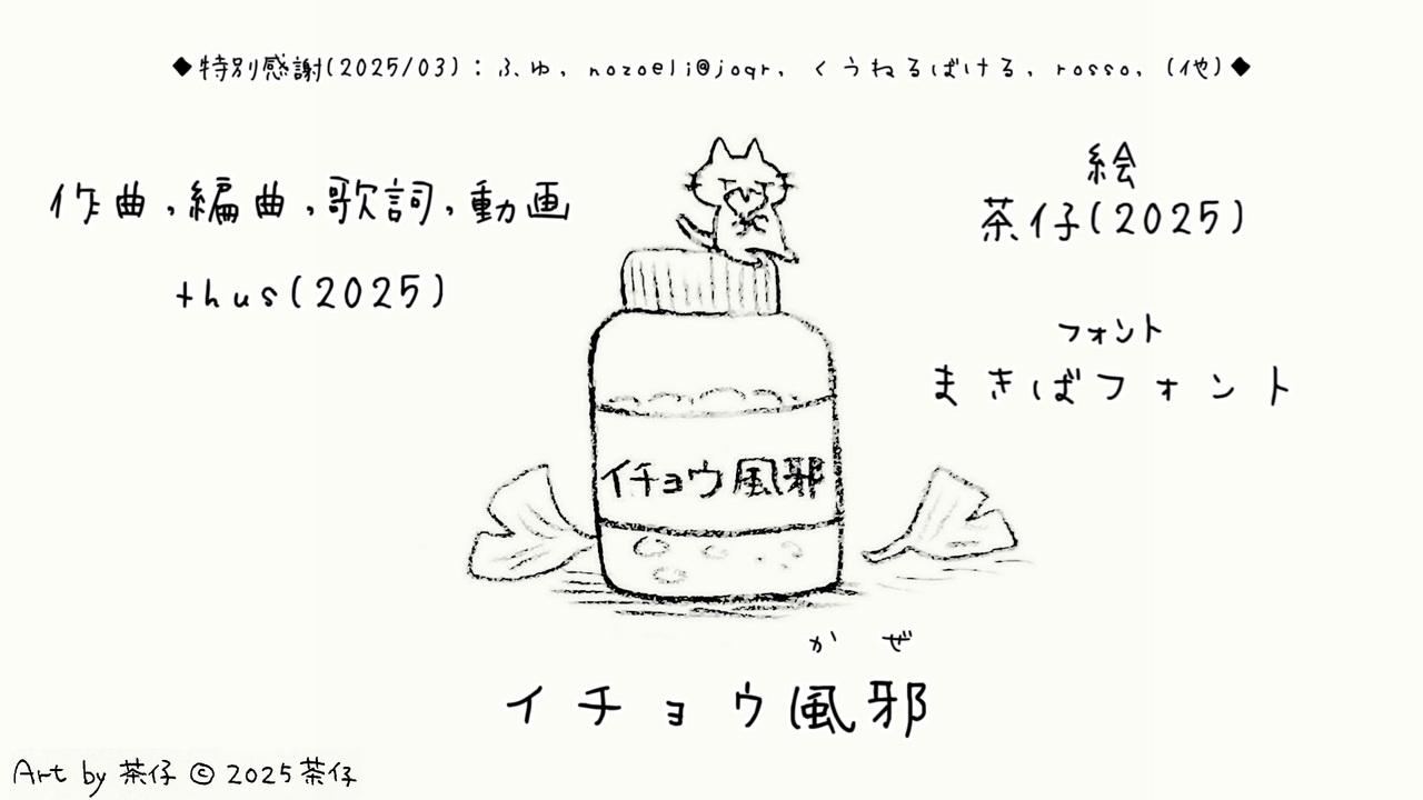 Art by 茶仔 © 2025 茶仔<br>(X:<a href="https://x.com/chacomalo" target="_blank" rel="noopener nofollow">https://x.com/chacomalo</a> )<br>―<br>◆「植物ソング投稿祭2025」出展作品です(詳細:<a href="https://twipla.jp/events/648580" target="_blank" rel="noopener nofollow">https://twipla.jp/events/648580</a> )<br>・開催日時:2025/04/(20 - 26)<br>・主催:unui(<a href="https://www.nicovideo.jp/user/13316840" target="_blank" rel="noopener">user/13316840</a> )<br>―――<br><br> 馬鹿みたいじゃない私。(カラオケ動画:<a href="https://www.nicovideo.jp/watch/sm44868813" class="watch">sm44868813</a> )<br> 銀杏の木が夭しくなる季節から粗丁度真逆の季節。イチョウ風邪は銀杏の木からうつる風邪だと思っていた私は、イチョウ風邪を秋の風物詩的に理解していました。茲最近は桜の木の伐採がトレンドみたいですが、BIGM●T●R的な悪意がある訳ではなく樹の寿命と其に伴う管理困難から世代交代を余儀なくされている様ですね。<br> 最近近くに弁当屋さんがあるのを見つけて、時々そこで弁当を買って食べる様になりました。安い奴を買うのが好きです。<br> 所で、背骨が痛いです。この背骨は四駆ではないので、宛らテーマパークの残骸です。モルタル製ですから。<br> 最近、というか人生に於いて常にではありますが、人間関係がどうも上手くいかなくて憔悴辟易しています。相談機関曰く、所謂不仲とかもうそんな次元の話じゃない公的機関介入レベルらしかったので、協力を得ながら頑張っております。3月末-4月初めはそのストレスで、胃が痛過ぎて3食抜かざるを得なかった(食べると吐いて逆に体力喪失)ですが、今は3食食べれるので大丈夫です。吐かずに食事できるって幸せ。<br> 今回は何だかふわふわと曖昧で纏まりのない文ですね。どうしてかって? 其はそう、言及が非常に難しい出来事ですから。言及が難しいイベントって最初書こうとしたのですが、そうすると丸で #植物ソング投稿祭2025 が言及に難しいという風に受け取れる気がして止めました、と言う文章で既に言及して了っているので、ご愁傷様です。<br> 取り敢えず無事です。何かあったら、何者かに爆殺されたんだなと思って下さい。<br><br> 何か全体的に不穏ですが、今回は久しく適当に文章を書いてみようと思って思いついた事を綴っただけなので、どうか冗談半分に。<br><br>・不穏って発音von(フォン)に似てるぜ!<br>・ほぉ~ん<br>・<i>Dynamic Bird</i><br><br> …最後に解毒として意味不明な事を一言書こうと思い3案出したのですが、3つ揃って初めて威力を発揮する気がしたので、いっそ全部書く事にしました。清浄な解毒作用ですね。<br><br>2025/04/22 00:31:2,525再生<br>2025/04/25 20:56:1万再生<br><br>―<br>クレジット不足を上書修正しました<br /><br><br><br>====================<br>| 2026/01/04 21:00「インスペクタの自死未遂」:<a href="https://www.nicovideo.jp/watch/sm45800854" class="watch">sm45800854</a><br>| 投稿曲マイリスト:<a href="https://www.nicovideo.jp/mylist/57867175" target="_blank" rel="noopener">mylist/57867175</a><br>|――――――――――――――――――<br>| pixivFANBOX:<a href="https://thus.fanbox.cc/" target="_blank" rel="noopener nofollow">https://thus.fanbox.cc/</a><br>| アルバム等配信中:<a href="https://thus-library.blogspot.com/search/label/discography" target="_blank" rel="noopener nofollow">https://thus-library.blogspot.com/search/label/discography</a><br>| つなぐ(依頼・リクエスト):<a href="https://tsunagu.cloud/users/thus" target="_blank" rel="noopener nofollow">https://tsunagu.cloud/users/thus</a><br>|――――――――――――――――――<br>| YouTube:<a href="https://youtube.com/@thus" target="_blank" rel="noopener nofollow">https://youtube.com/@thus</a><br>| X:<a href="https://x.com/thus_submission" target="_blank" rel="noopener nofollow">https://x.com/thus_submission</a><br>| 他全リンク:<a href="https://lit.link/thus" target="_blank" rel="noopener nofollow">https://lit.link/thus</a><br>|――――――――――――――――――<br>| オフボーカル等:<a href="https://piapro.jp/thus_999discommunication" target="_blank" rel="noopener nofollow">https://piapro.jp/thus_999discommunication</a><br>| 楽曲/動画の二次利用に関して:<a href="https://bit.ly/3JRQQiZ" target="_blank" rel="noopener nofollow">https://bit.ly/3JRQQiZ</a><br><span style="color: #262626;">| </span><span style="color: #262626;"><strong>歌詞図書館(ふりがな有るよ!):</strong></span><a href="https://thus-library.blogspot.com/" target="_blank" rel="noopener nofollow">https://thus-library.blogspot.com/</a><br>====================<br><br><a target="_blank" href="https://qa.nicovideo.jp/faq/show/19424?site_domain=default" style="font-size: 13px;color: #657586; text-decoration: underline; line-height: 1.4">この動画は投稿者によって修正されました</a>