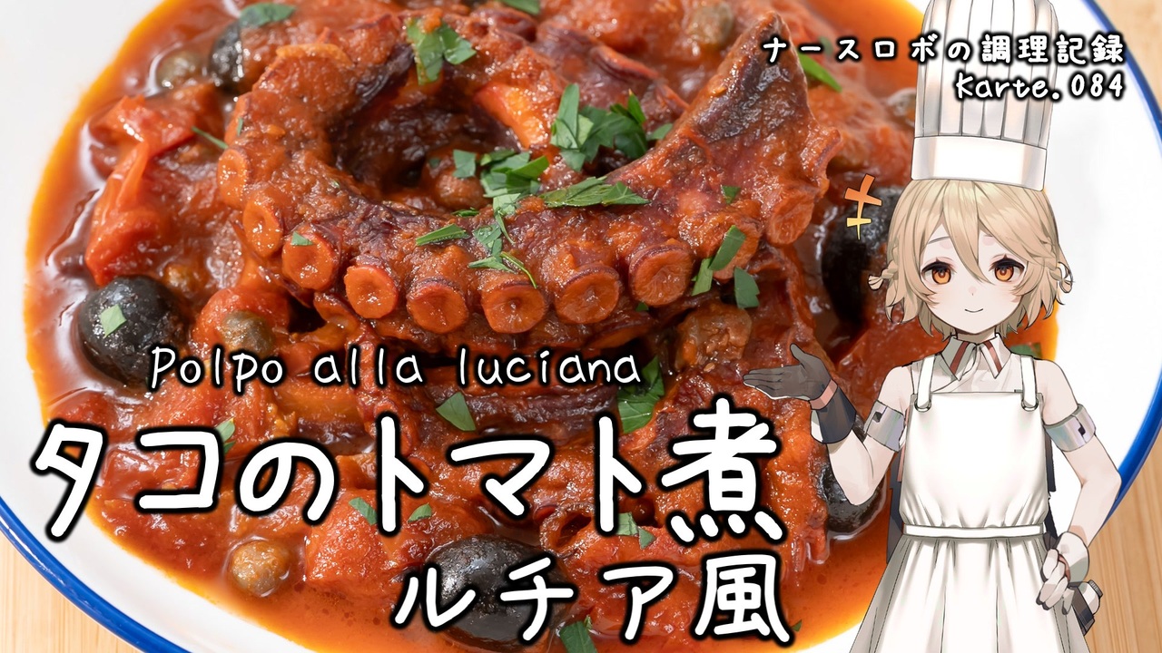Part84はシンプルなタコのトマト煮込みです!<br>イタリア語でPolpo alla luciana, Polpo affogatoと呼ばれるお料理です。<br>シンプルな分素材が大事なお料理なので調味料等を揃えてぜひ作ってみてくださいね。<br>パンと一緒に食べても、パスタと和えても美味しい一品です。<br><br>トマトソースのレシピはKarte.005を見てね!<br>→<a href="https://www.nicovideo.jp/watch/sm42747957" class="watch">sm42747957</a><br><br>音声: VOICEVOX:ナースロボ_タイプT<br>立ち絵: 捨て犬A<br>イラスト: いらすとや<br>SE: otologic, 効果音ラボ<br>BGM: BGMer<br /><br>[各種リンク]<br>ニコニコ動画: <a href="http://nicovideo.jp/user/130153578" target="_blank" rel="noopener nofollow">http://nicovideo.jp/user/130153578</a><br>YouTubeメイン(料理): <a href="http://youtube.com/@cooking25euph" target="_blank" rel="noopener nofollow">http://youtube.com/@cooking25euph</a><br>YouTubeサブ(料理以外): <a href="https://youtube.com/@sub25euph" target="_blank" rel="noopener nofollow">https://youtube.com/@sub25euph</a><br>X (twitter): <a href="https://twitter.com/nico25euph" target="_blank" rel="noopener nofollow">https://twitter.com/nico25euph</a><br>Bluesky: <a href="http://nico25euph.bsky.social" target="_blank" rel="noopener nofollow">http://nico25euph.bsky.social</a><br>TikTok: <a href="http://tiktok.com/@nico25euph" target="_blank" rel="noopener nofollow">http://tiktok.com/@nico25euph</a>