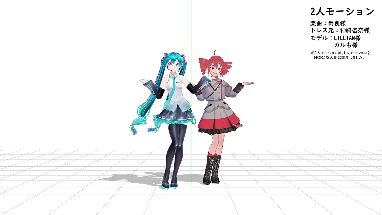 1人用モーションと2人用モーションをたいっつーフォロワー限定配布します。<br>期日:5/6/2025まで<br><a href="https://bowlroll.net/file/334573" target="_blank" rel="noopener nofollow">https://bowlroll.net/file/334573</a><br><a href="https://taittsuu.com/users/normmd" target="_blank" rel="noopener nofollow">https://taittsuu.com/users/normmd</a><br><br>【使用楽曲クレジット】<br>・Music/Lyric 雨良 Amala様 <a href="https://x.com/amaamaLa_" target="_blank" rel="noopener nofollow">https://x.com/amaamaLa_</a><br>・Movie 暗闇まよい様 <a href="https://x.com/kurayami_mayoi" target="_blank" rel="noopener nofollow">https://x.com/kurayami_mayoi</a><br>・Guitar : Kaichi様 <a href="https://x.com/Kaichi_zZ" target="_blank" rel="noopener nofollow">https://x.com/Kaichi_zZ</a><br>・ChorusEdit : 江戸川スミス様 <a href="https://x.com/edogawa_smith" target="_blank" rel="noopener nofollow">https://x.com/edogawa_smith</a><br>・Title Logo : kumika様 <a href="https://x.com/kumika_kmk" target="_blank" rel="noopener nofollow">https://x.com/kumika_kmk</a><br>・Choreography : 蛇の怪異様 <a href="https://x.com/hebinokai1" target="_blank" rel="noopener nofollow">https://x.com/hebinokai1</a><br>【トレス元】<br>・神綺杏奈様 <a href="https://www.youtube.com/shorts/9qZrMaODY8k" target="_blank" rel="noopener nofollow">https://www.youtube.com/shorts/9qZrMaODY8k</a><br>【使用モデル】<br>・LILLIAN様 <a href="https://www.youtube.com/watch?v=jqChkF-Vqp4" target="_blank" rel="noopener nofollow">https://www.youtube.com/watch?v=jqChkF-Vqp4</a><br>・カルも様 <a href="https://seiga.nicovideo.jp/seiga/im8471305" target="_blank" rel="noopener">im8471305</a>