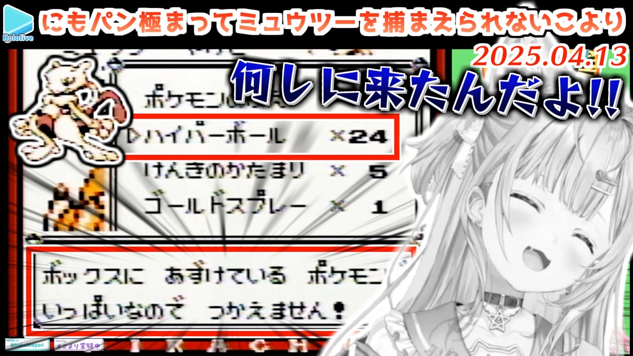 ふつくしい<br><br><a href="#" class="seekTime" data-seekTime="00:00" onclick="seekNicoPlayer('#00:00'); return false;">#00:00</a> ハナダの洞窟・道中<br><a href="#" class="seekTime" data-seekTime="00:52" onclick="seekNicoPlayer('#00:52'); return false;">#00:52</a> ミュウツー戦<br><a href="#" class="seekTime" data-seekTime="02:49" onclick="seekNicoPlayer('#02:49'); return false;">#02:49</a> にもパン<br><a href="#" class="seekTime" data-seekTime="04:31" onclick="seekNicoPlayer('#04:31'); return false;">#04:31</a> スロット事件<br><a href="#" class="seekTime" data-seekTime="08:37" onclick="seekNicoPlayer('#08:37'); return false;">#08:37</a> 仕切り直し<br><a href="#" class="seekTime" data-seekTime="12:37" onclick="seekNicoPlayer('#12:37'); return false;">#12:37</a> ころさんの場合<br><br>元動画様はこちら<br>【初代ポケモン】緊急耐久!9999枚まで旅に出られまてん!ポリゴンGETして、でんせつ&ポケモンリーグ!! 6 【博衣こより/ホロライブ】<br><a href="https://youtu.be/6lkKhlvEj94" target="_blank" rel="noopener nofollow">https://youtu.be/6lkKhlvEj94</a><br><br>1【ド★初見】ポケットモンスター(緑)遊びます【戌神ころね】<br><a href="https://youtu.be/31cYxgzqXz0" target="_blank" rel="noopener nofollow">https://youtu.be/31cYxgzqXz0</a><br><br>Koyori ch. 博衣こより - holoX - <a href="https://t.co/U4G9NUjWs5" target="_blank" rel="noopener nofollow">https://t.co/U4G9NUjWs5</a><br /><span style="color: #b7b7b7; font-size: 10px;">ホロライブ切り抜き/なめたけ <a href="https://t.co/CBwJLnYR2c" target="_blank" rel="noopener nofollow">https://t.co/CBwJLnYR2c</a></span>