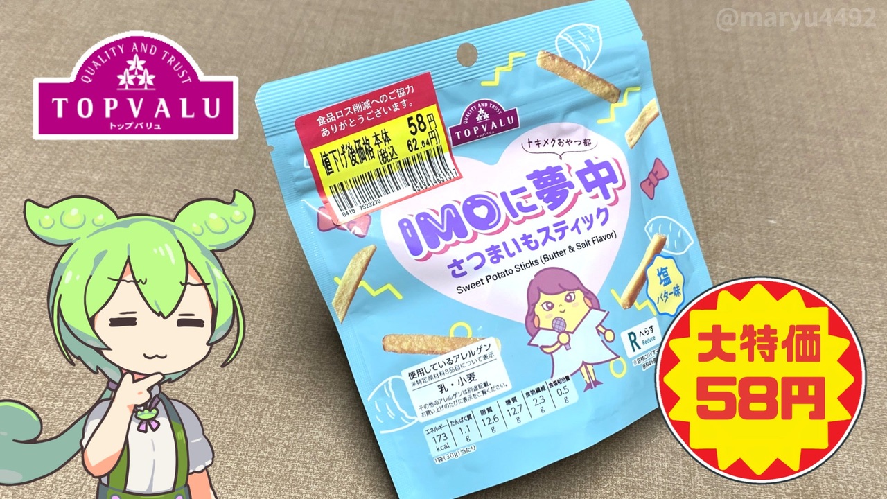 イオンのワゴンセールで見つけたさつまいものお菓子です。<br><br><br>【関連動画】<br>トップバリュの赤いヤツ「がんばる戦士グミと癒しの魔導士グミ」2024.04.02<br><a href="https://www.nicovideo.jp/watch/sm43593723" target="_blank" rel="noopener nofollow">https://www.nicovideo.jp/watch/sm43593723</a><br>トップバリュの赤いヤツ「野菜スナック(きんぴらごぼう・ブロッコリーベーコン味)」2024.04.11<br><a href="https://www.nicovideo.jp/watch/sm43636244" target="_blank" rel="noopener nofollow">https://www.nicovideo.jp/watch/sm43636244</a><br><br>【参考】<br>トキメクおやつ部 IMOに夢中 さつまいもスティック 塩バター味<br>※本体価格158円/30g(トップバリュ)<br><a href="https://www.topvalu.net/items/detail/4549414651317/" target="_blank" rel="noopener nofollow">https://www.topvalu.net/items/detail/4549414651317/</a><br>かわいい!おもしろい!おいしい!などココロトキメク感性を刺激する<br>「トップバリュ トキメクおやつ部シリーズ」第2弾が新発売!<br>2024.08.29(PR TIMES)<br><a href="https://prtimes.jp/main/html/rd/p/000004569.000007505.html" target="_blank" rel="noopener nofollow">https://prtimes.jp/main/html/rd/p/000004569.000007505.html</a><br><br>【使用した素材】(※敬称略) <br>(合成音声)VOICEVOX/ずんだもん/四国めたん/<br><a href="https://voicevox.hiroshiba.jp/" target="_blank" rel="noopener nofollow">https://voicevox.hiroshiba.jp/</a> <br>(立ち絵)坂本アヒル<br> <a href="https://seiga.nicovideo.jp/seiga/im10788496?track" target="_blank" rel="noopener nofollow">https://seiga.nicovideo.jp/seiga/im10788496?track</a><br>(楽曲)甘茶の音楽工房/「楽しい麦畑」「フルーツパフェ」「お城の舞踏会」<br><a href="https://amachamusic.chagasi.com/" target="_blank" rel="noopener nofollow">https://amachamusic.chagasi.com/</a>