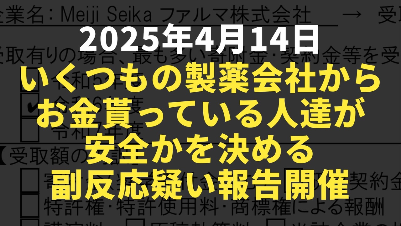 ※音声読み上げはありませんが、相変わらず利益相反なんじゃないかと言えるレベルで製薬会社からお金を貰っている人間が、ワクチン分科会に残っています<br><br><br>◆いくつもの製薬会社からお金貰っている人達が安全かを決める副反応疑い報告開催<br><br><br>厚生科学審議会(予防接種・ワクチン分科会 副反応検討部会)|厚生労働省<br><a href="https://www.mhlw.go.jp/stf/shingi/shingi-kousei_284075.html" target="_blank" rel="noopener nofollow">https://www.mhlw.go.jp/stf/shingi/shingi-kousei_284075.html</a><br><br><br>新型コロナワクチン<br>副反応疑い報告<br>製薬会社<br>献金<br>製薬マネー<br>利益相反<br>厚生労働省<br>審議会<br>予防接種<br>ワクチン<br>ニュース<br><br><br>マイリンク<br><a href="https://lit.link/keiichiro8140" target="_blank" rel="noopener nofollow">https://lit.link/keiichiro8140</a><br><br />著作権、肖像権に配慮して作成しております。<br><br>◆気になったニュースの台本!?<br>メモ代わりに作った台本をそのままあげてます<br><a href="https://keiichiro8140.hatenablog.com/." target="_blank" rel="noopener nofollow">https://keiichiro8140.hatenablog.com/.</a><br><br><br>ここからはシリーズ紹介<br><br><br>◆ ワクチン解毒・デトックス<br><a href="https://x.gd/fZweg" target="_blank" rel="noopener nofollow">https://x.gd/fZweg</a><br><br>◆ウイリアム・マキス博士のがん治療(イベルメクチン・フェンベンダゾール等)<br><a href="https://x.gd/AtFYS" target="_blank" rel="noopener nofollow">https://x.gd/AtFYS</a><br><br>◆予防接種健康被害救済制度<br><a href="https://x.gd/0xK9x" target="_blank" rel="noopener nofollow">https://x.gd/0xK9x</a><br><br>◆気になったニュース #1501~<br><br>◆ 【ショートver】気になったニュース<br><a href="https://x.gd/7MxXC" target="_blank" rel="noopener nofollow">https://x.gd/7MxXC</a><br><br>◆ 気になったニュース #1001~<br><a href="https://x.gd/Lp8gv" target="_blank" rel="noopener nofollow">https://x.gd/Lp8gv</a><br><br>◆ 気になったニュース #501~<br><a href="https://x.gd/EmbS4" target="_blank" rel="noopener nofollow">https://x.gd/EmbS4</a><br><br>◆ 気になったニュース #1~#500<br><a href="https://x.gd/uPhNb" target="_blank" rel="noopener nofollow">https://x.gd/uPhNb</a><br><br>◆ X(旧Twitter)・テレグラムで気になった情報<br><a href="https://x.gd/YG6FT" target="_blank" rel="noopener nofollow">https://x.gd/YG6FT</a><br><br>◆ 日比谷5万人パレードデ⚪生放送アーカイブ動画<br><a href="https://x.gd/3CHJv" target="_blank" rel="noopener nofollow">https://x.gd/3CHJv</a><br><br>◆日比谷5万人パレード⚪モのマイリスト作ってみました<br><a href="https://nico.ms/mylist/76828848?ref=sp_other" target="_blank" rel="noopener nofollow">https://nico.ms/mylist/76828848?ref=sp_other</a><br><br>◆3.30 令和の百姓⚪⚪<br><a href="https://www.nicovideo.jp/series/511791?ref=garage_share_other" target="_blank" rel="noopener nofollow">https://www.nicovideo.jp/series/511791?ref=garage_share_other</a><br><br>◆ 及川幸久さんの【XNEWS】シリーズ<br><a href="https://x.gd/3k78K" target="_blank" rel="noopener nofollow">https://x.gd/3k78K</a><br><br>◆これまでの動画<a href="https://x.gd/sPXoJ" target="_blank" rel="noopener nofollow">https://x.gd/sPXoJ</a><br><br>◆もしも(BAN)の時のためのマイリンク集<a href="https://lit.link/K-16_News44" target="_blank" rel="noopener nofollow">https://lit.link/K-16_News44</a><br><br>