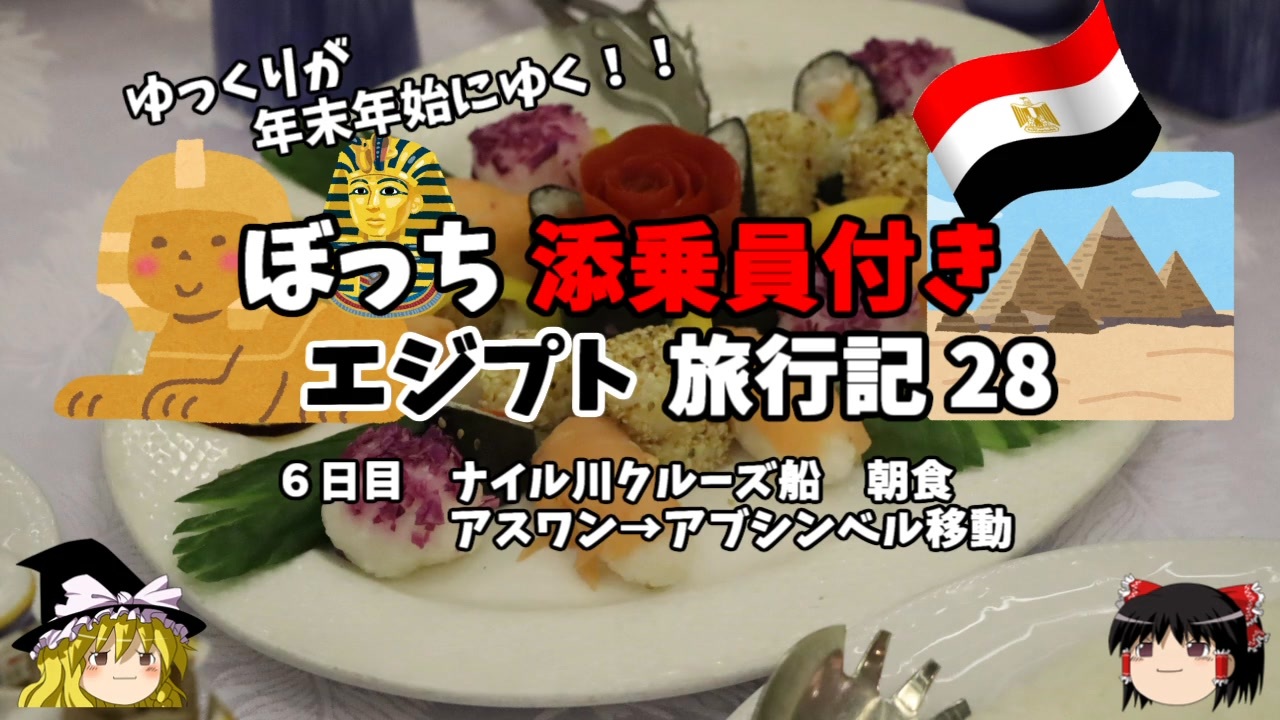 <span style="color: #ff0000; font-size: medium;"><u>※Youtubeで1話分、先行配信中 </u></span><br><span style="color: #0000ff; font-size: medium;"> <a href="http://www.youtube.com/c/なめこのぼっち旅" target="_blank" rel="noopener nofollow">http://www.youtube.com/c/なめこのぼっち旅</a></span><br><br><br>2023~2024年の年末年始にエジプト旅行に行ってきました!<br>その模様をお伝えします!<br><br><span style="color: #ff0000;">コミュニティー→co2910020</span><br><br>twitter→<a href="https://twitter.com/ryontan" target="_blank" rel="noopener nofollow">https://twitter.com/ryontan</a><br><br><a href="https://www.nicovideo.jp/watch/sm44877605" class="watch">sm44877605</a>← 前回 <span style="color: #ff0000;">次回 → <a href="https://www.nicovideo.jp/watch/sm44968699" class="watch">sm44968699</a></span><br><br>今作 エジプト旅行記→<a href="https://www.nicovideo.jp/mylist/77227599" target="_blank" rel="noopener">mylist/77227599</a><br>前作 飛鳥Ⅱクルーズ乗船記→<a href="https://www.nicovideo.jp/mylist/75717836" target="_blank" rel="noopener">mylist/75717836</a><br>北海道車中泊旅行記→<a href="https://www.nicovideo.jp/mylist/73483035" target="_blank" rel="noopener">mylist/73483035</a><br>モルディブ旅行記→<a href="https://www.nicovideo.jp/mylist/72339602" target="_blank" rel="noopener">mylist/72339602</a><br>東欧旅行記→<a href="https://www.nicovideo.jp/mylist/70339665" target="_blank" rel="noopener">mylist/70339665</a><br>解説・雑談系→<a href="https://www.nicovideo.jp/mylist/63171869" target="_blank" rel="noopener">mylist/63171869</a><br>スイス旅行記<span style="color: #000000; font-size: 14px;">→</span><a href="https://www.nicovideo.jp/mylist/68347869" target="_blank" rel="noopener">mylist/68347869</a><br>スペイン周遊記→<a href="https://www.nicovideo.jp/mylist/64537827" target="_blank" rel="noopener">mylist/64537827</a><br>韓国トルコ旅行記→<a href="https://www.nicovideo.jp/mylist/63654428" target="_blank" rel="noopener">mylist/63654428</a><br>車中泊旅行記→<a href="https://www.nicovideo.jp/mylist/54706524" target="_blank" rel="noopener">mylist/54706524</a><br>久米島(沖縄)旅行記→<a href="https://www.nicovideo.jp/mylist/63059251" target="_blank" rel="noopener">mylist/63059251</a><br>イギリスタイ旅行記→<a href="https://www.nicovideo.jp/mylist/60044833" target="_blank" rel="noopener">mylist/60044833</a><br>クルーズ旅行記→<a href="https://www.nicovideo.jp/mylist/57397685" target="_blank" rel="noopener">mylist/57397685</a><br>ドイツ周遊記→<a href="https://www.nicovideo.jp/mylist/54938346" target="_blank" rel="noopener">mylist/54938346</a><br>北海道旅行記→<a href="https://www.nicovideo.jp/mylist/52618057" target="_blank" rel="noopener">mylist/52618057</a><br>アメリカ横断記→<a href="https://www.nicovideo.jp/mylist/48621785" target="_blank" rel="noopener">mylist/48621785</a><br>イタリア周遊記→<a href="https://www.nicovideo.jp/mylist/45763559" target="_blank" rel="noopener">mylist/45763559</a><br>NY旅行記→<a href="https://www.nicovideo.jp/mylist/44343854" target="_blank" rel="noopener">mylist/44343854</a>