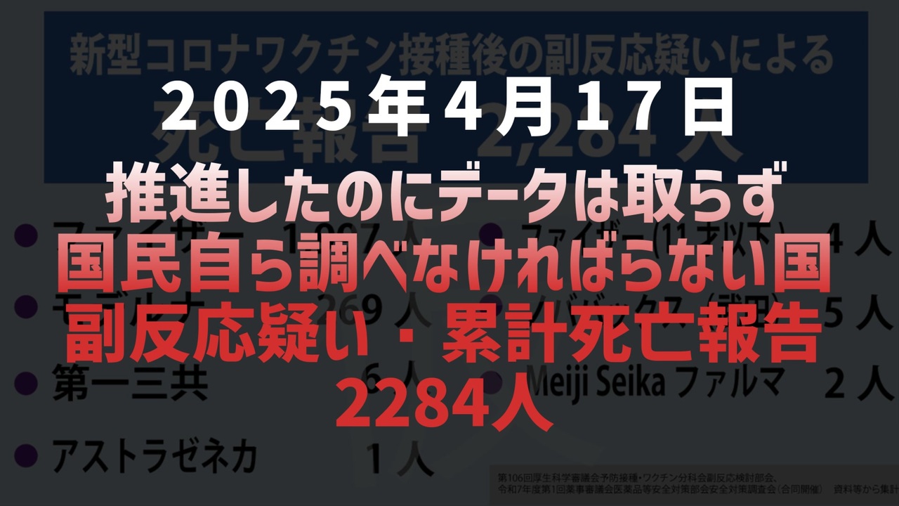 新型コロナワクチン接種後に副反応の疑いで死亡が報告された人数――その数はなんと2,284人。しかし、この数字は厚労省が発表したものではありません。国民の一人が、公的資料を丹念に読み解いて導き出したものです。ファイザー製だけで1,997人、モデルナ、ノババックスなどのデータも含まれます。推進はするが、責任ある情報公開はしない。そんな日本の現実に静かに問いを投げかける内容です。<br><br><br>◆ 今回の台本<br><a href="https://keiichiro8140.hatenablog.com/entry/20250417003" target="_blank" rel="noopener nofollow">https://keiichiro8140.hatenablog.com/entry/20250417003</a><br><br><br>コロナワクチン<br>ワクチン副反応<br>ワクチン死亡報告<br>厚労省<br>副反応疑い報告<br>ファイザー<br>モデルナ<br>ノババックス<br>MeijiSeikaファルマ<br>ワクチン推進<br>データ公表せず<br><br><br>マイリンク<br><a href="https://lit.link/keiichiro8140" target="_blank" rel="noopener nofollow">https://lit.link/keiichiro8140</a><br><br><br />著作権、肖像権に配慮して作成しております。<br><br>◆気になったニュースの台本!?<br>メモ代わりに作った台本をそのままあげてます<br><a href="https://keiichiro8140.hatenablog.com/." target="_blank" rel="noopener nofollow">https://keiichiro8140.hatenablog.com/.</a><br><br><br>ここからはシリーズ紹介<br><br><br>◆ ワクチン解毒・デトックス<br><a href="https://x.gd/fZweg" target="_blank" rel="noopener nofollow">https://x.gd/fZweg</a><br><br>◆ウイリアム・マキス博士のがん治療(イベルメクチン・フェンベンダゾール等)<br><a href="https://x.gd/AtFYS" target="_blank" rel="noopener nofollow">https://x.gd/AtFYS</a><br><br>◆予防接種健康被害救済制度<br><a href="https://x.gd/0xK9x" target="_blank" rel="noopener nofollow">https://x.gd/0xK9x</a><br><br>◆気になったニュース #1501~<br><br>◆ 【ショートver】気になったニュース<br><a href="https://x.gd/7MxXC" target="_blank" rel="noopener nofollow">https://x.gd/7MxXC</a><br><br>◆ 気になったニュース #1001~<br><a href="https://x.gd/Lp8gv" target="_blank" rel="noopener nofollow">https://x.gd/Lp8gv</a><br><br>◆ 気になったニュース #501~<br><a href="https://x.gd/EmbS4" target="_blank" rel="noopener nofollow">https://x.gd/EmbS4</a><br><br>◆ 気になったニュース #1~#500<br><a href="https://x.gd/uPhNb" target="_blank" rel="noopener nofollow">https://x.gd/uPhNb</a><br><br>◆ X(旧Twitter)・テレグラムで気になった情報<br><a href="https://x.gd/YG6FT" target="_blank" rel="noopener nofollow">https://x.gd/YG6FT</a><br><br>◆ 日比谷5万人パレードデ⚪生放送アーカイブ動画<br><a href="https://x.gd/3CHJv" target="_blank" rel="noopener nofollow">https://x.gd/3CHJv</a><br><br>◆日比谷5万人パレード⚪モのマイリスト作ってみました<br><a href="https://nico.ms/mylist/76828848?ref=sp_other" target="_blank" rel="noopener nofollow">https://nico.ms/mylist/76828848?ref=sp_other</a><br><br>◆3.30 令和の百姓⚪⚪<br><a href="https://www.nicovideo.jp/series/511791?ref=garage_share_other" target="_blank" rel="noopener nofollow">https://www.nicovideo.jp/series/511791?ref=garage_share_other</a><br><br>◆ 及川幸久さんの【XNEWS】シリーズ<br><a href="https://x.gd/3k78K" target="_blank" rel="noopener nofollow">https://x.gd/3k78K</a><br><br>◆これまでの動画<a href="https://x.gd/sPXoJ" target="_blank" rel="noopener nofollow">https://x.gd/sPXoJ</a><br><br>◆もしも(BAN)の時のためのマイリンク集<a href="https://lit.link/K-16_News44" target="_blank" rel="noopener nofollow">https://lit.link/K-16_News44</a><br><br>