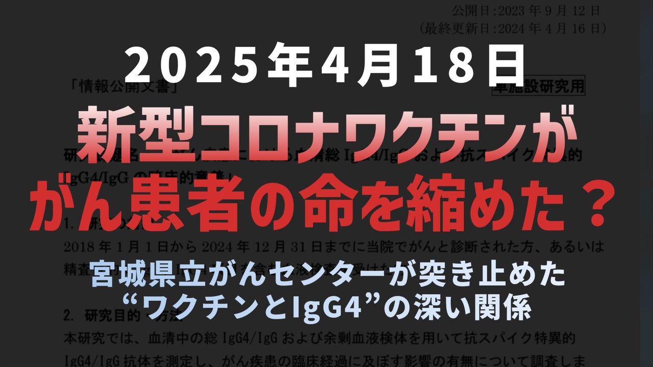 宮城県立がんセンターの研究チームが、ワクチン接種とがん患者の生存期間に関する注目の研究結果を発表。<br>繰り返しmRNAワクチンを接種した膵臓がん患者では、血中のIgG4という抗体が上昇し、それが生存期間の短縮と関係している可能性が示されました。<br>とくにIgG4の値が高かったグループでは、有意に寿命が短くなっていたという事実は見過ごせません。<br>2023年のネイチャー誌論文をもとに進められたこの研究は、「がん患者もワクチンを打つべき」という従来の前提を揺るがすもの。<br>医療のあり方を問う、静かな警鐘です。<br><br><br>◆ 今回の台本<br><a href="https://keiichiro8140.hatenablog.com/entry/20250418001" target="_blank" rel="noopener nofollow">https://keiichiro8140.hatenablog.com/entry/20250418001</a><br><br><br>mRNAワクチン<br>繰り返し接種<br>IgG4<br>膵臓がん<br>宮城県立がんセンター<br>虻江誠<br>ネイチャー論文<br>ワクチン副反応<br>免疫抑制<br>プレプリント<br>ワクチン<br><br>抗体バランス<br>がん治療<br>医師の責任<br>見直される接種方針<br><br><br>マイリンク<br><a href="https://lit.link/keiichiro8140" target="_blank" rel="noopener nofollow">https://lit.link/keiichiro8140</a><br><br><br />著作権、肖像権に配慮して作成しております。<br><br>◆気になったニュースの台本!?<br>メモ代わりに作った台本をそのままあげてます<br><a href="https://keiichiro8140.hatenablog.com/." target="_blank" rel="noopener nofollow">https://keiichiro8140.hatenablog.com/.</a><br><br><br>ここからはシリーズ紹介<br><br><br>◆ ワクチン解毒・デトックス<br><a href="https://x.gd/fZweg" target="_blank" rel="noopener nofollow">https://x.gd/fZweg</a><br><br>◆ウイリアム・マキス博士のがん治療(イベルメクチン・フェンベンダゾール等)<br><a href="https://x.gd/AtFYS" target="_blank" rel="noopener nofollow">https://x.gd/AtFYS</a><br><br>◆予防接種健康被害救済制度<br><a href="https://x.gd/0xK9x" target="_blank" rel="noopener nofollow">https://x.gd/0xK9x</a><br><br>◆気になったニュース #1501~<br><br>◆ 【ショートver】気になったニュース<br><a href="https://x.gd/7MxXC" target="_blank" rel="noopener nofollow">https://x.gd/7MxXC</a><br><br>◆ 気になったニュース #1001~<br><a href="https://x.gd/Lp8gv" target="_blank" rel="noopener nofollow">https://x.gd/Lp8gv</a><br><br>◆ 気になったニュース #501~<br><a href="https://x.gd/EmbS4" target="_blank" rel="noopener nofollow">https://x.gd/EmbS4</a><br><br>◆ 気になったニュース #1~#500<br><a href="https://x.gd/uPhNb" target="_blank" rel="noopener nofollow">https://x.gd/uPhNb</a><br><br>◆ X(旧Twitter)・テレグラムで気になった情報<br><a href="https://x.gd/YG6FT" target="_blank" rel="noopener nofollow">https://x.gd/YG6FT</a><br><br>◆ 日比谷5万人パレードデ⚪生放送アーカイブ動画<br><a href="https://x.gd/3CHJv" target="_blank" rel="noopener nofollow">https://x.gd/3CHJv</a><br><br>◆日比谷5万人パレード⚪モのマイリスト作ってみました<br><a href="https://nico.ms/mylist/76828848?ref=sp_other" target="_blank" rel="noopener nofollow">https://nico.ms/mylist/76828848?ref=sp_other</a><br><br>◆3.30 令和の百姓⚪⚪<br><a href="https://www.nicovideo.jp/series/511791?ref=garage_share_other" target="_blank" rel="noopener nofollow">https://www.nicovideo.jp/series/511791?ref=garage_share_other</a><br><br>◆ 及川幸久さんの【XNEWS】シリーズ<br><a href="https://x.gd/3k78K" target="_blank" rel="noopener nofollow">https://x.gd/3k78K</a><br><br>◆これまでの動画<a href="https://x.gd/sPXoJ" target="_blank" rel="noopener nofollow">https://x.gd/sPXoJ</a><br><br>◆もしも(BAN)の時のためのマイリンク集<a href="https://lit.link/K-16_News44" target="_blank" rel="noopener nofollow">https://lit.link/K-16_News44</a><br><br>
