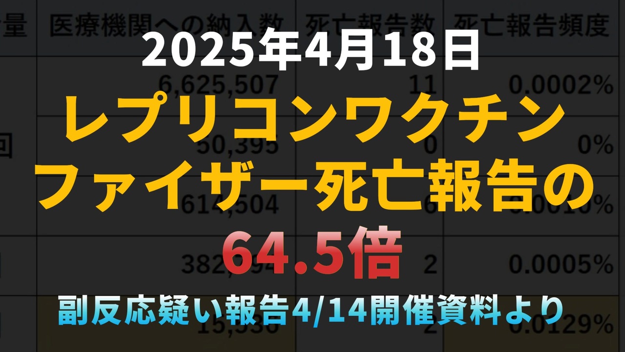 ◆致命的失敗?レプリコンワクチン、納入0.4%・死亡率64倍の衝撃<br><br><br>政府の資料から明らかになった、明治製菓ファルマのレプリコンワクチンの異常事態。供給予定のわずか0.4%しか納入されず、死亡報告率はファイザーの64.5倍。医療現場も市場も、この製品にNOを突きつけた結果か。安全性への疑念が現実の数字として浮かび上がっています。<br><br><br>◆ 今回の台本<br><a href="https://keiichiro8140.hatenablog.com/entry/20250418003" target="_blank" rel="noopener nofollow">https://keiichiro8140.hatenablog.com/entry/20250418003</a><br><br><br>レプリコンワクチン<br>死亡報告<br>ファイザーの64.5倍<br>明治製菓ファルマ<br>MeijiSeikaファルマ<br>コスタイベ<br>自己増幅型ワクチン<br>ワクチン副反応<br>コロナワクチン<br>ファイザー<br>ニュース<br><br><br>マイリンク<br><a href="https://lit.link/keiichiro8140" target="_blank" rel="noopener nofollow">https://lit.link/keiichiro8140</a><br><br><br />著作権、肖像権に配慮して作成しております。<br><br>◆気になったニュースの台本!?<br>メモ代わりに作った台本をそのままあげてます<br><a href="https://keiichiro8140.hatenablog.com/." target="_blank" rel="noopener nofollow">https://keiichiro8140.hatenablog.com/.</a><br><br><br>ここからはシリーズ紹介<br><br><br>◆ ワクチン解毒・デトックス<br><a href="https://x.gd/fZweg" target="_blank" rel="noopener nofollow">https://x.gd/fZweg</a><br><br>◆ウイリアム・マキス博士のがん治療(イベルメクチン・フェンベンダゾール等)<br><a href="https://x.gd/AtFYS" target="_blank" rel="noopener nofollow">https://x.gd/AtFYS</a><br><br>◆予防接種健康被害救済制度<br><a href="https://x.gd/0xK9x" target="_blank" rel="noopener nofollow">https://x.gd/0xK9x</a><br><br>◆気になったニュース #1501~<br><br>◆ 【ショートver】気になったニュース<br><a href="https://x.gd/7MxXC" target="_blank" rel="noopener nofollow">https://x.gd/7MxXC</a><br><br>◆ 気になったニュース #1001~<br><a href="https://x.gd/Lp8gv" target="_blank" rel="noopener nofollow">https://x.gd/Lp8gv</a><br><br>◆ 気になったニュース #501~<br><a href="https://x.gd/EmbS4" target="_blank" rel="noopener nofollow">https://x.gd/EmbS4</a><br><br>◆ 気になったニュース #1~#500<br><a href="https://x.gd/uPhNb" target="_blank" rel="noopener nofollow">https://x.gd/uPhNb</a><br><br>◆ X(旧Twitter)・テレグラムで気になった情報<br><a href="https://x.gd/YG6FT" target="_blank" rel="noopener nofollow">https://x.gd/YG6FT</a><br><br>◆ 日比谷5万人パレードデ⚪生放送アーカイブ動画<br><a href="https://x.gd/3CHJv" target="_blank" rel="noopener nofollow">https://x.gd/3CHJv</a><br><br>◆日比谷5万人パレード⚪モのマイリスト作ってみました<br><a href="https://nico.ms/mylist/76828848?ref=sp_other" target="_blank" rel="noopener nofollow">https://nico.ms/mylist/76828848?ref=sp_other</a><br><br>◆3.30 令和の百姓⚪⚪<br><a href="https://www.nicovideo.jp/series/511791?ref=garage_share_other" target="_blank" rel="noopener nofollow">https://www.nicovideo.jp/series/511791?ref=garage_share_other</a><br><br>◆ 及川幸久さんの【XNEWS】シリーズ<br><a href="https://x.gd/3k78K" target="_blank" rel="noopener nofollow">https://x.gd/3k78K</a><br><br>◆これまでの動画<a href="https://x.gd/sPXoJ" target="_blank" rel="noopener nofollow">https://x.gd/sPXoJ</a><br><br>◆もしも(BAN)の時のためのマイリンク集<a href="https://lit.link/K-16_News44" target="_blank" rel="noopener nofollow">https://lit.link/K-16_News44</a><br><br>