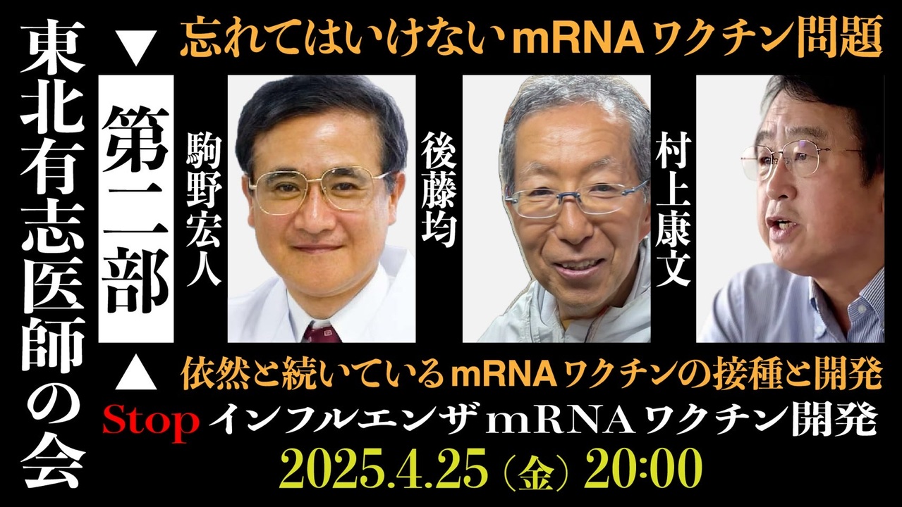 =========================<br>忘れてはいけないmRNAワクチン問題:依然と続いているmRNAワクチンの接種と開発<br>【第二部】 StopインフルエンザmRNAワクチン開発<br>=========================<br><br>1)そもそもインフルエンザワクチンは効いているのか<br>2)インフルエンザmRNAワクチン等の開発状況、危険性<br><br>東京理科大学名誉教授<br> 村上康文<br><br>薬学博士<br> 駒野宏人<br><br>ごとう整形外科 手外科クリニック<br> 院長 後藤均<br><br>=========================<br>