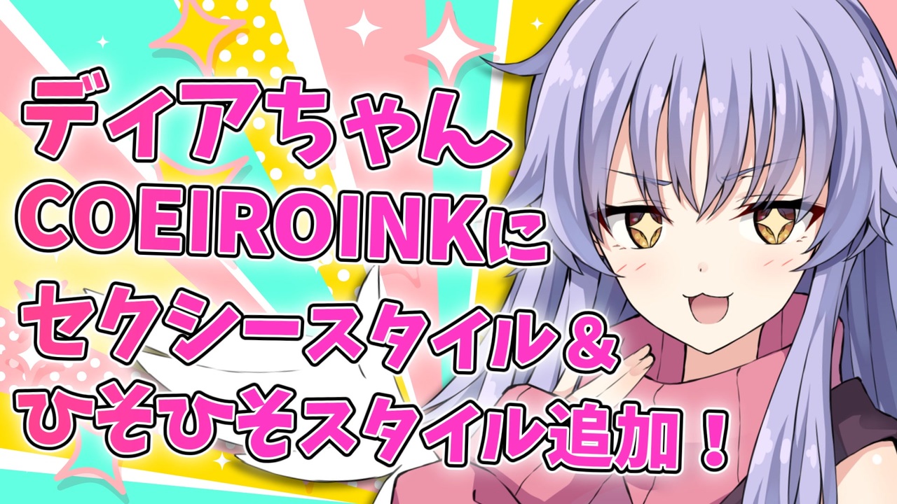 2025/4/18<br>不定期投稿の告知動画だよ<br><br>ディアちゃんの新スタイルが追加されたよ!<br>「セクシー」と「ひそひそ」の2スタイルになるよ<br>表現の幅がぐっと広がると思うからぜひ使ってみてね💜<br><br>COEIROINKサイトでサンプルも聞けるからぜひ試してみてね!<br><a href="https://coeiroink.com/character/audio-character/dia-m" target="_blank" rel="noopener nofollow">https://coeiroink.com/character/audio-character/dia-m</a><br><br>◆アルマちゃん@twitter<br><a href="https://twitter.com/arma_prg" target="_blank" rel="noopener nofollow">https://twitter.com/arma_prg</a><br><br>◆Lusty*Kiss Production 公式サイト<br><a href="https://production.lusty-kiss.com/" target="_blank" rel="noopener nofollow">https://production.lusty-kiss.com/</a><br><br>◆Lusty*Kiss Production YouTubeチャンネル<br><a href="https://www.youtube.com/channel/UCfxvv69Q0j0k2Rvm8x9vEhQ" target="_blank" rel="noopener nofollow">https://www.youtube.com/channel/UCfxvv69Q0j0k2Rvm8x9vEhQ</a><br><br>◆COEIROINK 公式サイト<br><a href="https://coeiroink.com/" target="_blank" rel="noopener nofollow">https://coeiroink.com/</a><br><br>------出演------<br>アルマちゃん:アルマちゃん@COEIROINK<br><a href="https://coeiroink.com/character/audio-character/arma-p" target="_blank" rel="noopener nofollow">https://coeiroink.com/character/audio-character/arma-p</a><br>ディアちゃん:ディアちゃん@COEIROINK<br><a href="https://coeiroink.com/character/audio-character/dia-m" target="_blank" rel="noopener nofollow">https://coeiroink.com/character/audio-character/dia-m</a><br><br>------立ち絵------<br>アルマちゃん立ち絵素材(ふらすこ 様)<br><a href="https://seiga.nicovideo.jp/seiga/im11121973" target="_blank" rel="noopener nofollow">https://seiga.nicovideo.jp/seiga/im11121973</a><br>ディアちゃん立ち絵素材(ふらすこ 様)<br><a href="https://seiga.nicovideo.jp/seiga/im11121967" target="_blank" rel="noopener nofollow">https://seiga.nicovideo.jp/seiga/im11121967</a><br><br>------使用素材 ------<br>ディアちゃんの休日<br><a href="https://commons.nicovideo.jp/material/nc266496" target="_blank" rel="noopener nofollow">https://commons.nicovideo.jp/material/nc266496</a><br>効果音ラボ 様 【効果音ラボ】ジャン!<br><a href="https://soundeffect-lab.info/" target="_blank" rel="noopener nofollow">https://soundeffect-lab.info/</a>