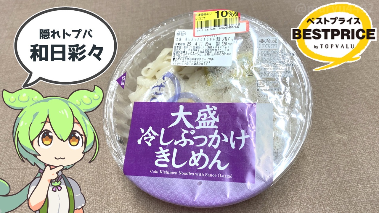 4月も下旬に入り、暖かな日が増えてきました。<br>今日は冷たいものが食べたくなり、ビッグできしめんを買ってきました。<br><br><br><br>【忌まわしき記憶】<br>トップバリュの赤いヤツ「冷やしぶっかけ天ぷらうどん(30%引き)」2023.04.18<br><a href="https://www.nicovideo.jp/watch/sm42091854" target="_blank" rel="noopener nofollow">https://www.nicovideo.jp/watch/sm42091854</a><br><br>【関連動画】<br>トップバリュの「ゆでずに簡単 水でほぐすだけ そば(177円)」2025.03.31<br><a href="https://www.nicovideo.jp/watch/sm44825751" target="_blank" rel="noopener nofollow">https://www.nicovideo.jp/watch/sm44825751</a><br>トップバリュとマルちゃんの「ざるラーメン」2025年版 2025.04.08<br><a href="https://www.nicovideo.jp/watch/sm44855776" target="_blank" rel="noopener nofollow">https://www.nicovideo.jp/watch/sm44855776</a><br><br>【参考】<br>2月7日(金)朝8時「ザ・ビッグ大垣河間(おおがきがま)店」オープン※PDFファイル<br><a href="https://www.aeonbig.co.jp/assets/pdf/news_250203.pdf" target="_blank" rel="noopener nofollow">https://www.aeonbig.co.jp/assets/pdf/news_250203.pdf</a><br>名古屋の味 ころきしめん2人前(寿がきや)<br><a href="https://www.sugakiya.co.jp/products/chirudo/chiru_y_7379.html?id=7379" target="_blank" rel="noopener nofollow">https://www.sugakiya.co.jp/products/chirudo/chiru_y_7379.html?id=7379</a><br><br>【使用した素材】(※敬称略) <br>(合成音声)VOICEVOX/ずんだもん/四国めたん/<br><a href="https://voicevox.hiroshiba.jp/" target="_blank" rel="noopener nofollow">https://voicevox.hiroshiba.jp/</a> <br>(立ち絵)坂本アヒル<br> <a href="https://seiga.nicovideo.jp/seiga/im10788496?track" target="_blank" rel="noopener nofollow">https://seiga.nicovideo.jp/seiga/im10788496?track</a><br>(楽曲)甘茶の音楽工房/「楽しい麦畑」「フルーツパフェ」「お城の舞踏会」<br><a href="https://amachamusic.chagasi.com/" target="_blank" rel="noopener nofollow">https://amachamusic.chagasi.com/</a>